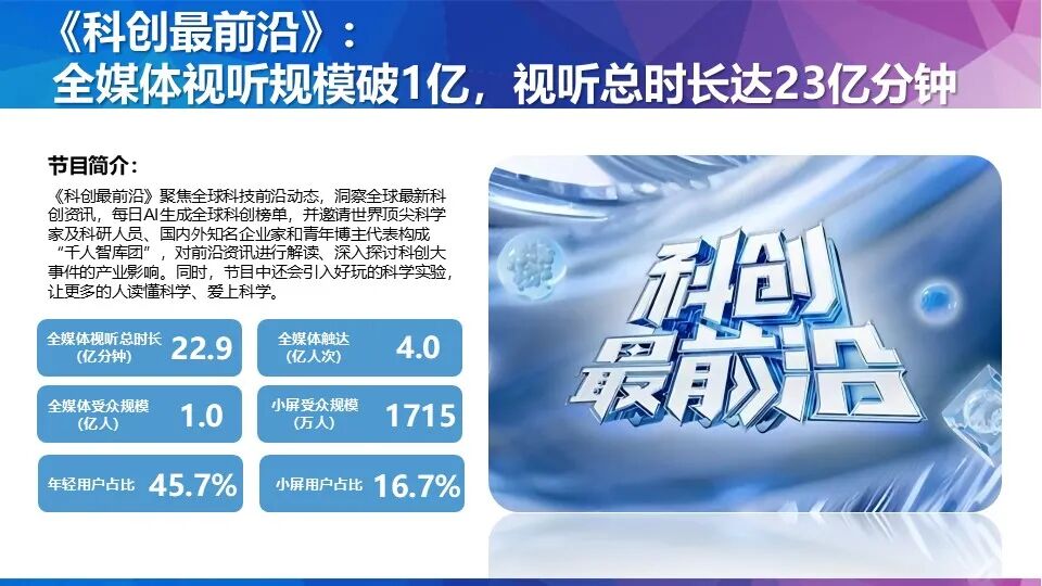 据CSM NewTAM全媒体同源测量数据显示,播出3个月以来,《科技最前沿》节目全媒体受众触达超过4.0亿次,全媒体视听总时长超过22.9亿分钟,全媒体受众规模超过1亿人(其中小屏受众规模超过1715万人),年轻用户占比为45.7%,小屏用户占比为16.7%。