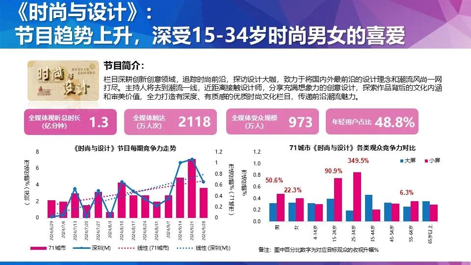 根据CSM NewTAM全媒体同源测量数据显示,《时尚与设计》节目播出14期,全媒体受众触达超过2100万人次,全媒体视听总时长超过1.3亿分钟,全媒体受众接近千万,年轻用户的占比超过48%。在71城市,节目的大屏市场竞争力也呈上升趋势,且15-34岁观众的市场份额较改版前同时段有明显提升。
