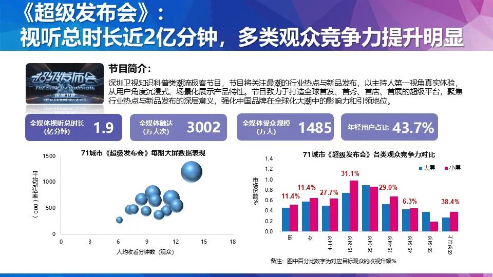 深圳卫视改版后,《超级发布会》共播出了12期。根据CSM NewTAM全媒体同源测量数据显示,节目的全媒体受众触达超过3千万人次,全媒体视听总时长接近2亿分钟,全媒体受众规模接近1500万,年轻受众占比超过43%。节目在71城市的大屏中也收获多个类别观众的支持,竞争力均有不同程度的提升,其中15-24岁观众收视最高且提升幅度最大。