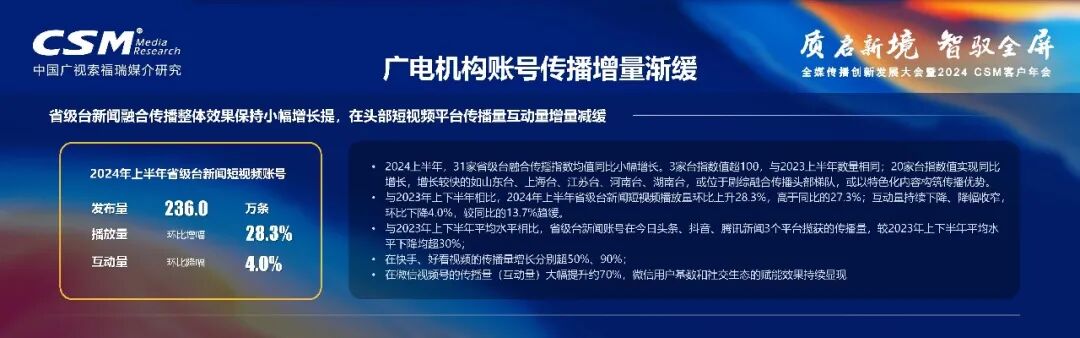 传统电视频道、广播频率与广电融媒账号矩阵,共同构成了现阶段广电机构全媒体传播的主要力量。融媒账号矩阵由新闻账号、剧综账号以及专业主播账号共同构成,并呈现偏重新闻传播、机构账号传播和短视频传播三个明显特点。进入2024年,机构账号的传播增长趋势有所放缓。面对这一变化,广电机构亟需挖掘新的增长潜力。