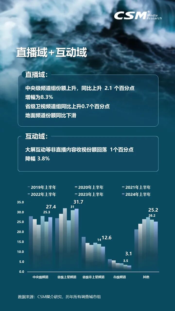 省级卫视频道的整体市场份额近32%,其中头部五大卫视市场份额占据超一半比例。半数省级地面频道收视份额同比上升,22家城市台频道收视份额同比增长。