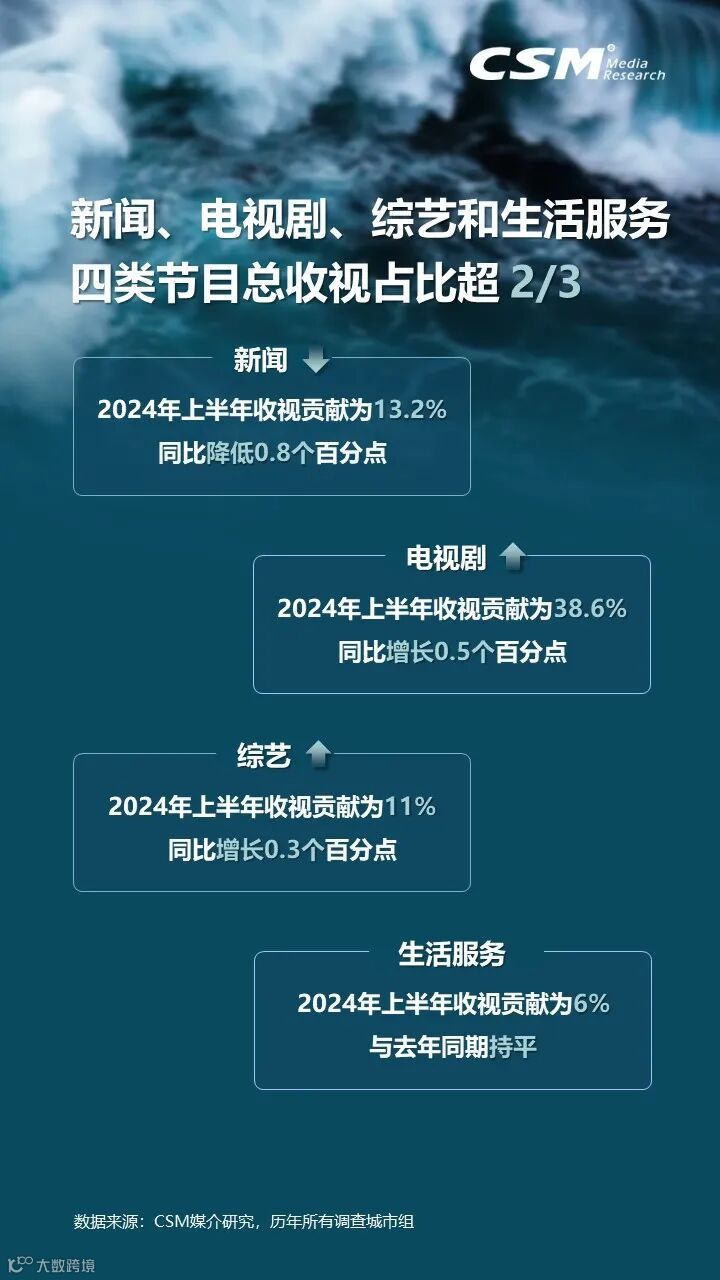 电视剧、综艺和体育类节目收视比重有所提升。在百花齐放的电视剧市场中,精细化发展的赛道促使剧集题材更加丰富多样,表达手法也不断创新。在2024上半年,电视剧收视贡献为38.6%,上星(央卫视)频道占77.1%,份额有所上升。
