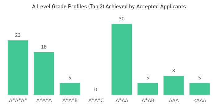 绝大多数录取者的成绩为3A*,其次是2A*1A,这也是在剑桥官网所写到的最低录取要求。但从整体数据来看,录取者的成绩下限要比其官网说明的更低,3A甚至3A以下也有可能被录取。
