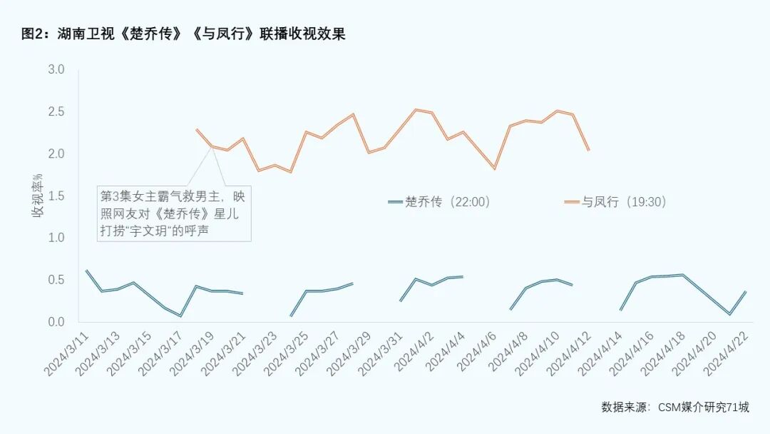 一是湖南卫视《楚乔传》和《与凤行》的梦幻联动。2017年6月5日,湖南卫视在次黄档播出《楚乔传》,剧中赵丽颖和林更新主演的星儿与宇文玥坠入冰湖,悲剧结局让诸多观众意难平,以至于产生“打捞宇文玥”的“执念”。2024年3月18日,湖南卫视晚黄档播出二人主演的仙侠剧《与凤行》,男主落水后被女主搭救,“宇文玥”成功上岸,观众终于圆梦。湖南卫视在开播前一周即开启联动预告,层层铺垫造势,并在3月11日次黄档播出《楚乔传》,以每天2集的速度逐步预热,3月18日《与凤行》于晚黄档播出,形成二剧联动播出的格局,最终《与凤行》以2.26%的收视率收官。