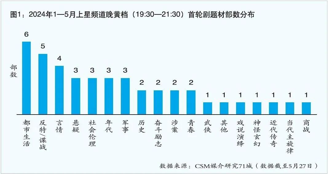 今年上半年,卫视晚黄档被现实题材剧集霸屏。1—5月,上星频道晚黄档播出首轮剧42部,次黄档播出首轮剧9部。晚黄档现实题材剧集29部,占比约70%,其中,当代剧26部,现代剧3部;近代题材剧8部,古装题材剧5部。