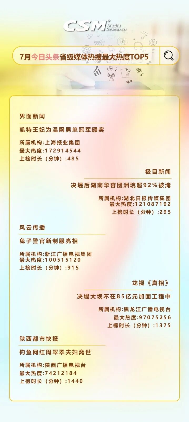 移动端屏幕不断闪烁着“爆”与“热”的词条,在这一连串因关注而加速运转的齿轮中,哪些瞬间触动了你的心弦,激发了你新的思考维度与前行方向?CSM数据显示,7月份,省级主流媒体在新媒体平台上,共有超5000条内容登上热搜热榜。从王楚钦爆冷出局引热议,到特朗普竞选集会的惊魂枪响,再到北大回应网传韦神的慷慨解囊,每条背后都有令人难忘的瞬间。