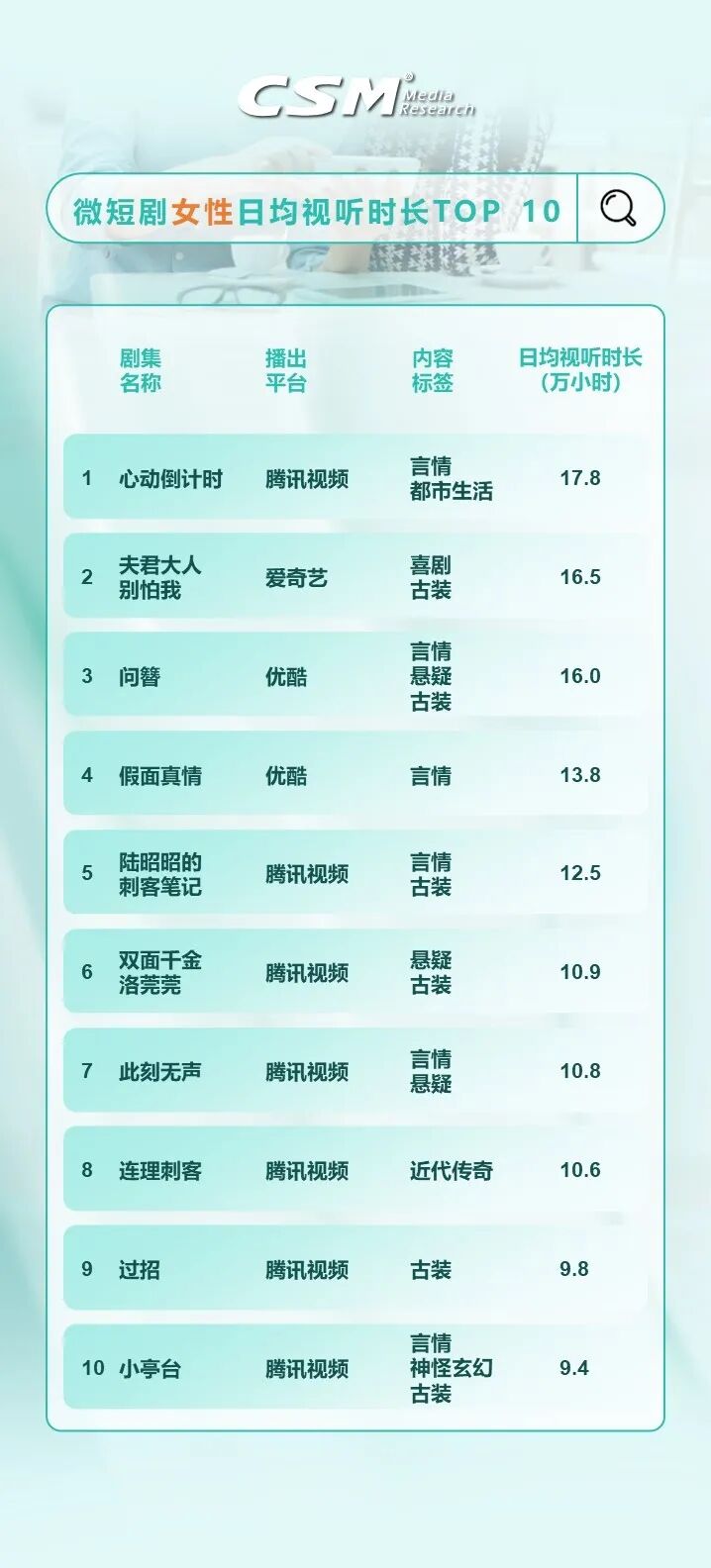 CSM NewTAM视听同源数据平台全面覆盖了大屏与移动端两大领域的数据监测。在移动端数据中,特别聚焦于热度较高的头部剧集、综艺、纪录片及网络电影,这些作品构成了内容生态的核心。值得一提的是,除了广为人知的电视剧集,剧集市场近年又迎来了一股新生力量——微短剧。这种新兴的内容形式凭借其紧凑的节奏、精简的时长以及引人入胜的情境,迅速吸引了年轻观众的眼球,使他们为之倾倒,纷纷表示“欲罢不能”。微短剧已然成为当下流行的“新电子榨菜”,引领了剧集市场的新潮流。