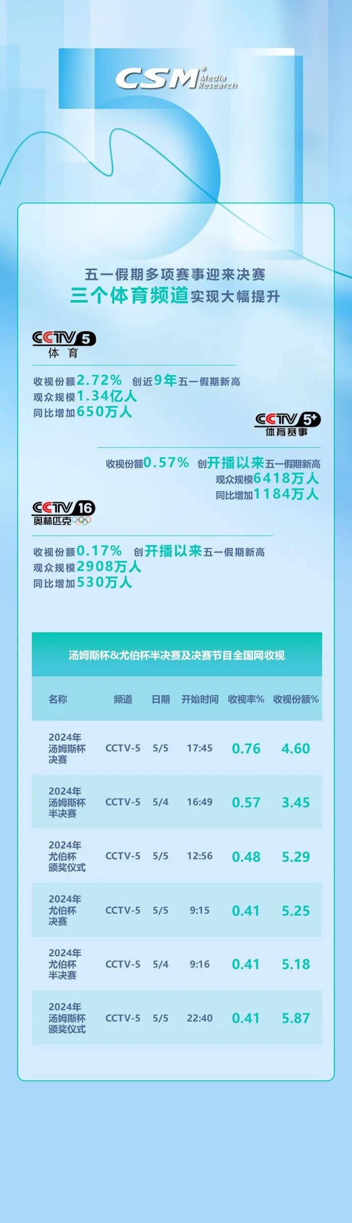 此外,体育赛事方面也是亮点纷呈,恰逢多项赛事迎来激动人心的决赛,汤姆斯杯&尤伯杯赛场热闹非凡,CCTV5、CCTV5+体育赛事频道和CCTV16三个体育频道收视率大幅提升,为观众带来了一场场体育盛宴。