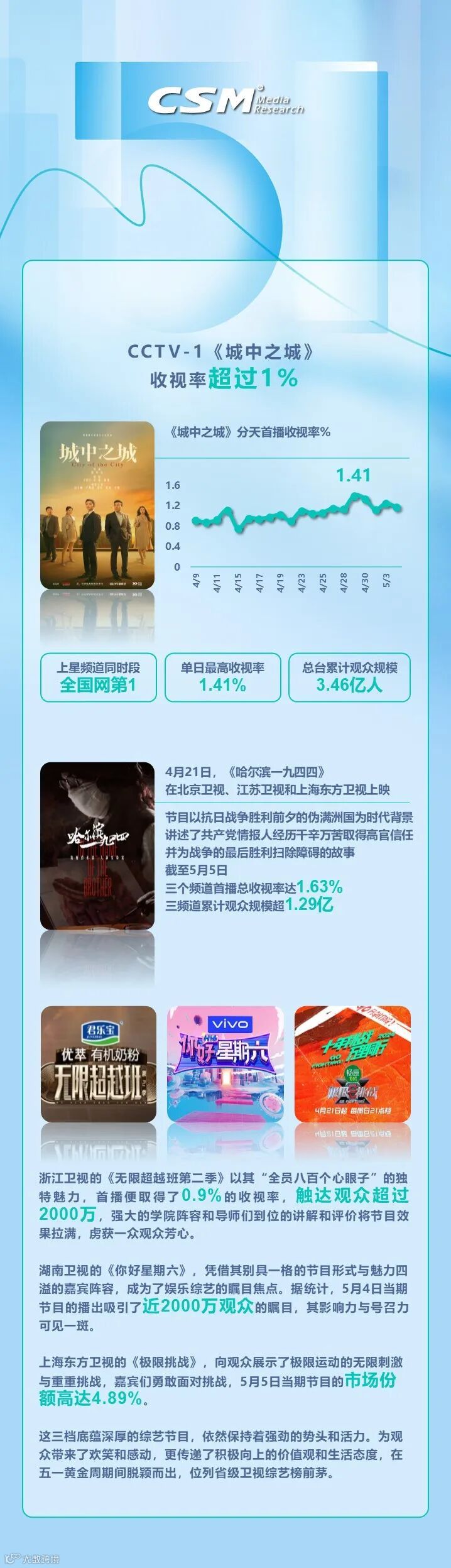 总台精心策划的《中国梦劳动美2024五一国际劳动节心连心特别节目》与《闪光的青春2024五四青年节特别节目》两档晚会,更是将节日氛围推向了高潮。它们以精彩纷呈的演出和感人至深的故事,展现了劳动之美和青春风采,赢得了广大观众的热烈掌声。同时,在剧集方面,《城中之城》凭借其引人入胜的剧情和精湛的演技赢得了观众的一致好评,总台累计观众规模达3.46亿人。