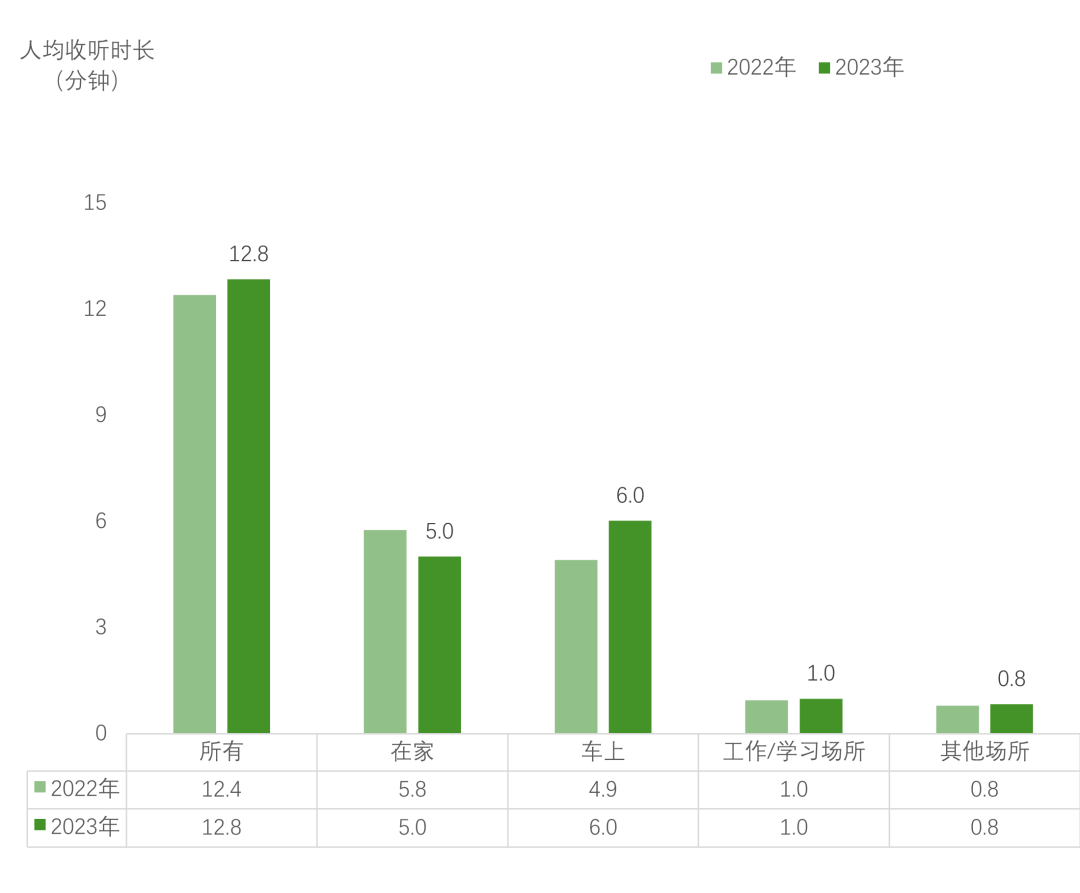 2023年,音乐类频率人均每日收听时长12.8分钟,相较上年同期的12.4分钟基本持平, “在家”和“车上”仍是音乐类频率听众最主要的收听地点。2023年受到新冠疫情全面解除防控的影响,音乐类频率“在家”人均收听时长相较上年有所下降,而车载音乐类频率的人均收听时长稳中有升,同比增长22.5%,在其他场所收听时长基本不变(图5)。