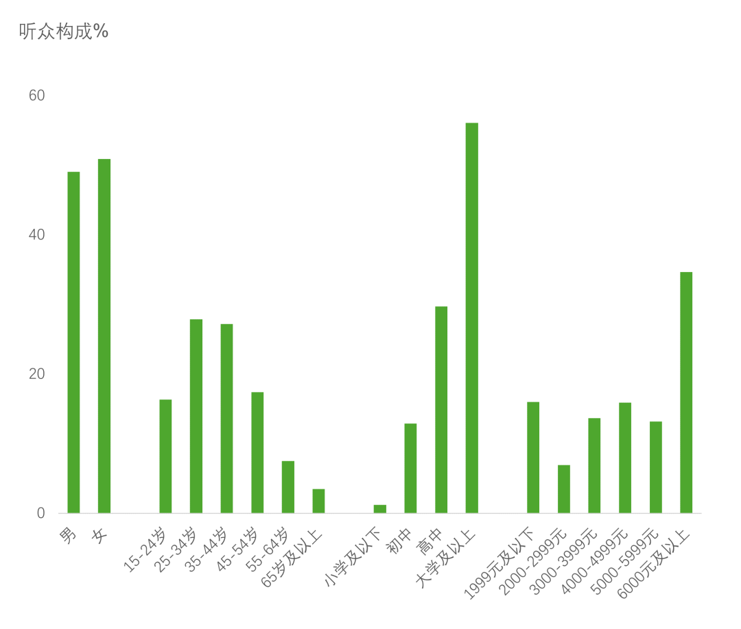 ▫ 音乐类频率听众以女性、中青年、高知及高收入人群为主