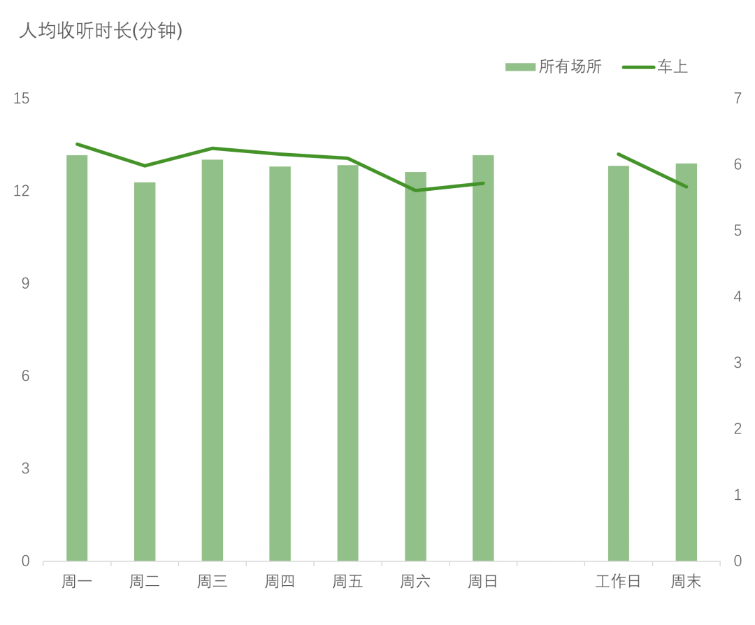 根据音乐类频率不同周天的收听时长对比可以看出,所有场所中不同周天之间以及工作日和周末之间的差异较小,各天收听量保持稳定,人均收听时长基本在13分钟上下。而在车载收听场所中,由于大部分听众在周末和工作日的作息安排有所区别,因此收听量的差异也相对显著,周末两天较周一至周五的平均收听量有所减少(图7)。