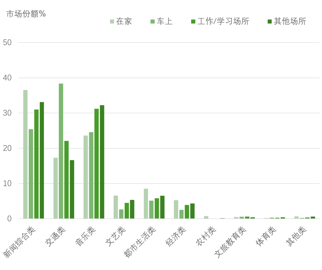 因节目内容各具特色,不同频率在各类场所的收听效果也有所差异。新闻综合类频率在家中的市场份额最高,达36.5%;交通类频率在车载市场的收听表现最优,占据整体市场近四成,达38.4%;音乐类频率在工作/学习场所以31.2%的市场份额位居第一,在家以及在其他场所的市场份额分别为23.6%和32.2%,均仅次于新闻综合频率位列第二,在车载市场的收听占比24.6%,排名第三(图2)。