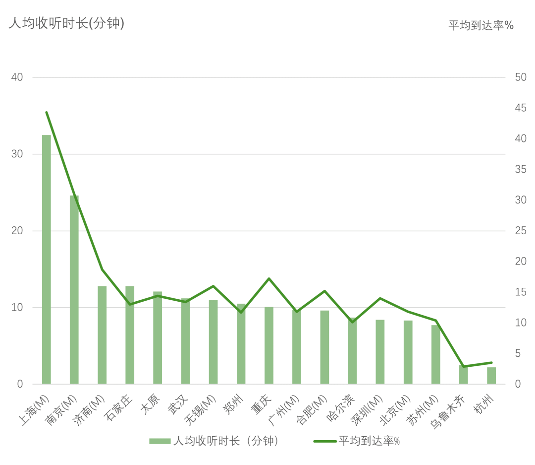 综合两个指标来看,音乐类频率在上海和南京的收听表现较为出色,其到达率和收听量水平较高且发展均衡;而乌鲁木齐和杭州的音乐频率收听表现仍有待提升。