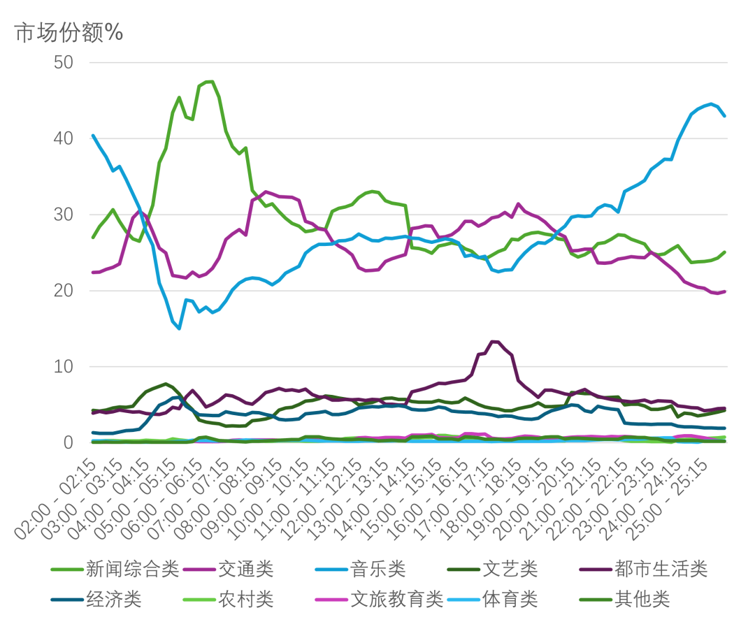 根据各类频率全天市场份额走势可以看出,相较于其他各类频率,新闻综合、交通和音乐类频率全天各时段竞争力更优。其中,新闻综合类频率早间5:00-8:00时段优势明显,在早上6:30左右达到峰值,占据近一半的市场份额;交通类频率全天收听表现较为稳定,早上8:00-10:00以及下午14:00-19:00时段的竞争力更为强劲;音乐类频率则是从18:00开始发力,市场份额稳步攀升,自20:00后始终领先于其他各频率(图3)。