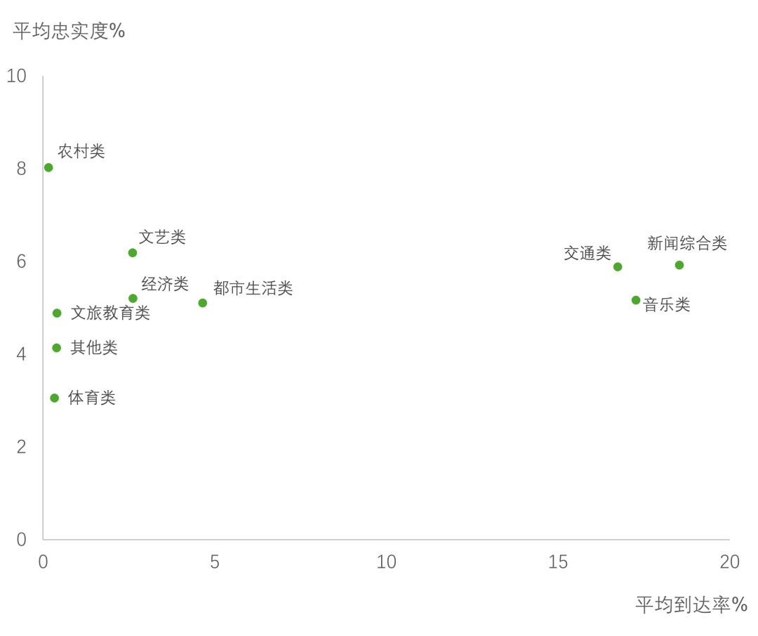 平均到达率反映了各类频率听众收听的广度(即听众规模),而平均忠实度则反映了听众收听的深度(即听众黏性)。从这两个重要维度可以看出,新闻综合、交通和音乐这三类频率的听众规模都十分突出,而农村和文艺类频率的听众黏性占优,听众规模有待增长。音乐类频率在听众规模(平均到达率%)上,仅次于新闻综合类频率,且差距较小;但是在听众黏性(平均忠实度%)上,音乐类频率排名稍显落后,有较大的提升空间(图4)。