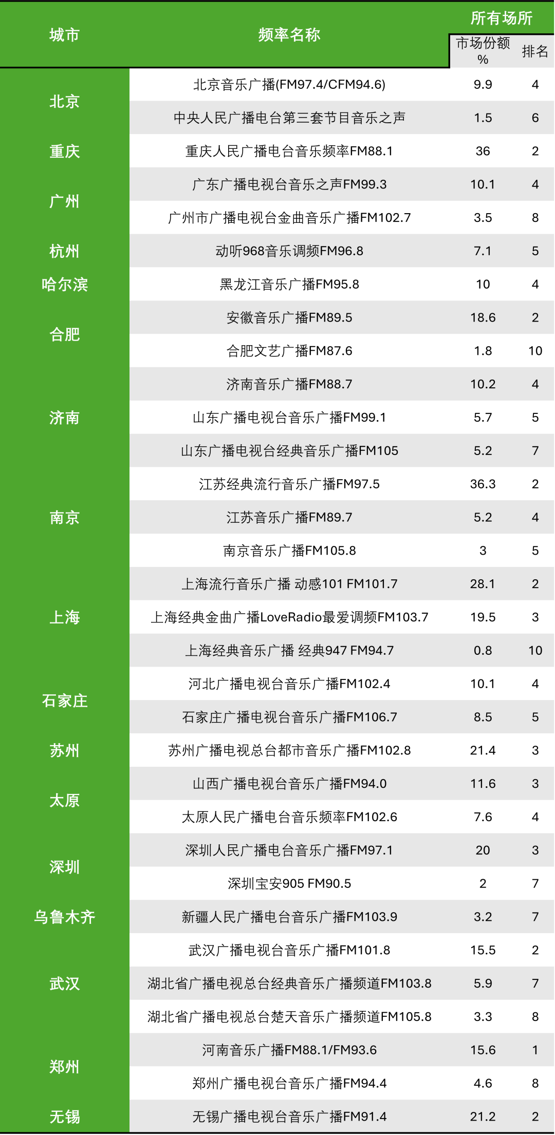 纵观全国17个城市中主要音乐类频率在本地的竞争力水平,在所有场所收听中,共有32个音乐类频率在当地市场的份额排名进入前十位。其中,重庆人民广播电台音乐频率FM88.1、江苏经典流行音乐广播FM97.5、上海流行音乐广播 动感101 FM101.7、深圳人民广播电台音乐广播FM97.1、苏州广播电视总台都市音乐广播FM102.8以及无锡广播电视台音乐广播FM91.4在本地市场的份额水平表现突出,单频率份额就超过了20%。河南音乐广播FM88.1/FM93.6在当地市场表现出色,所有频率份额排名中位居第一(表1)。