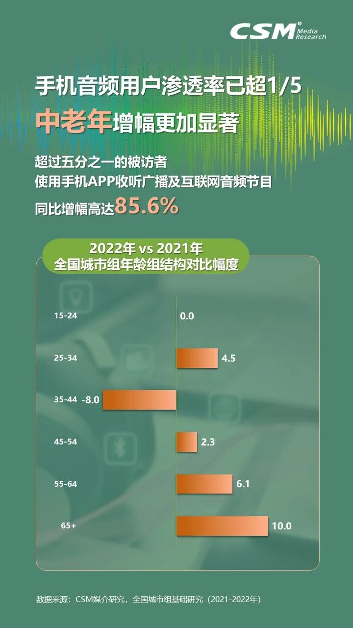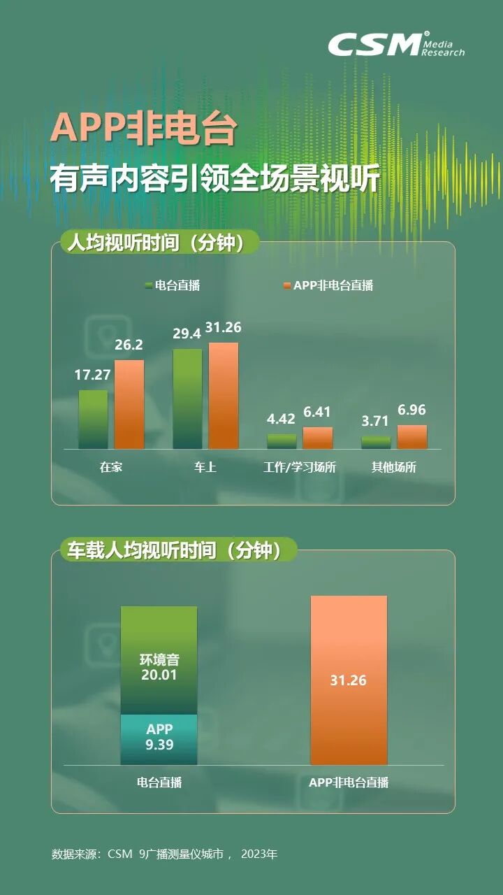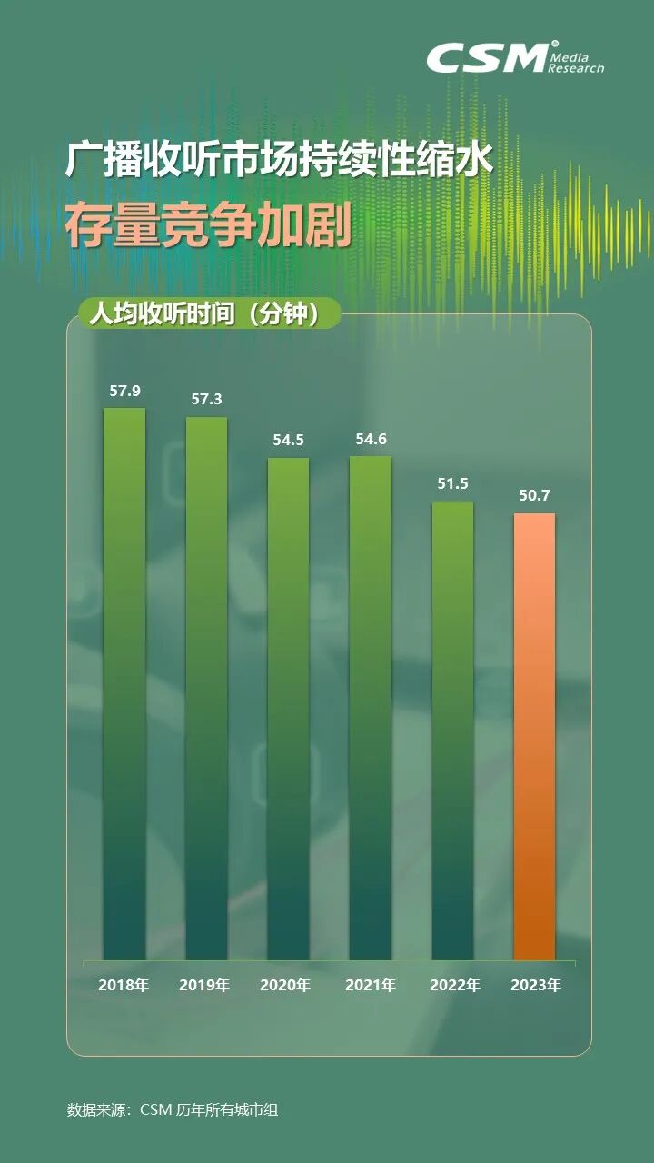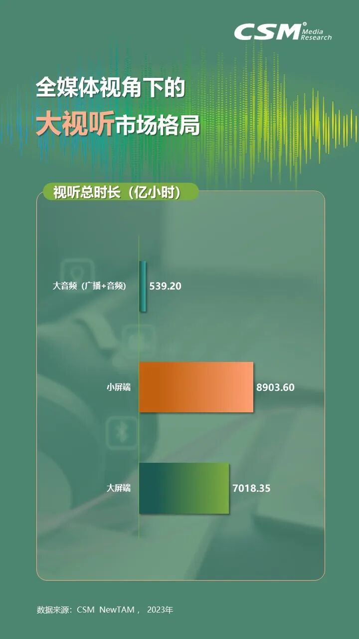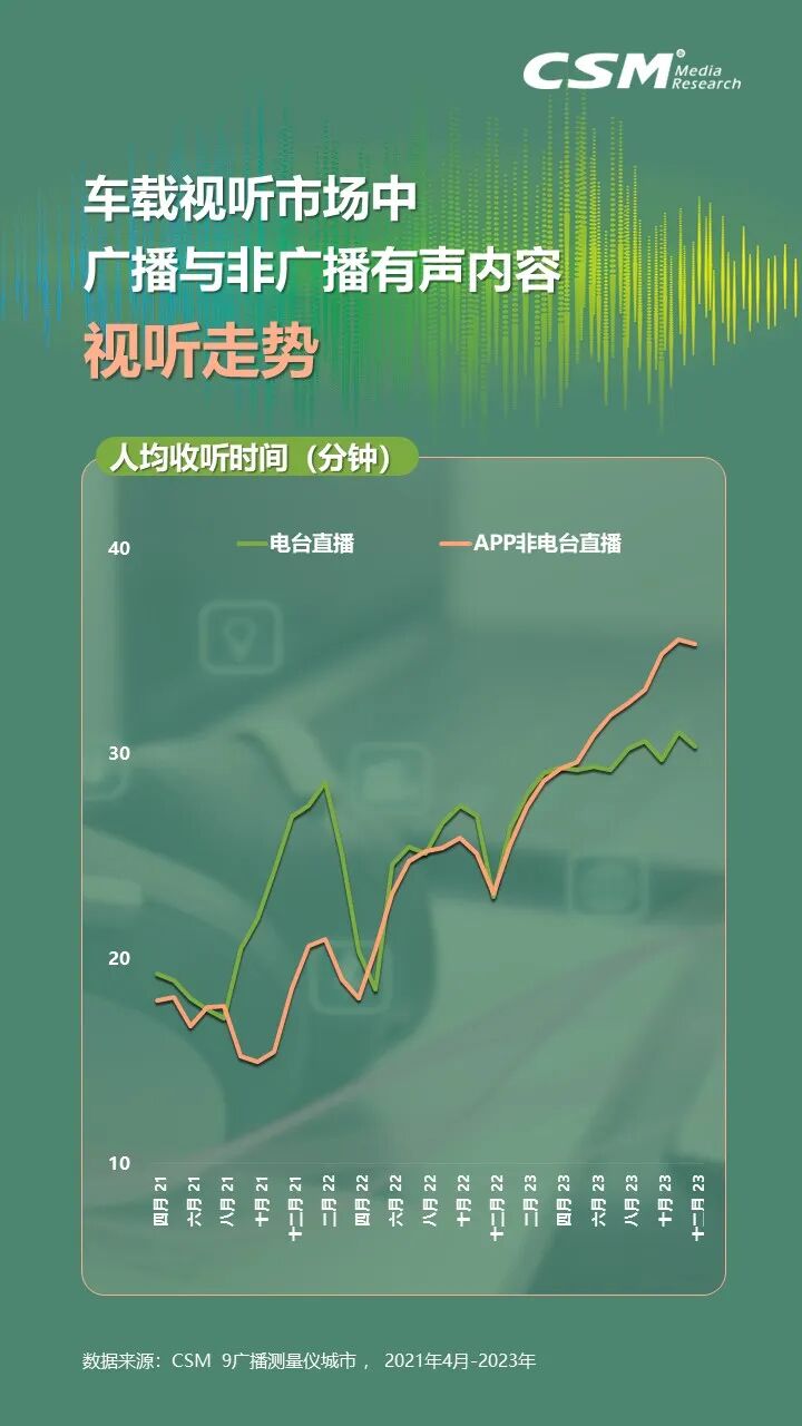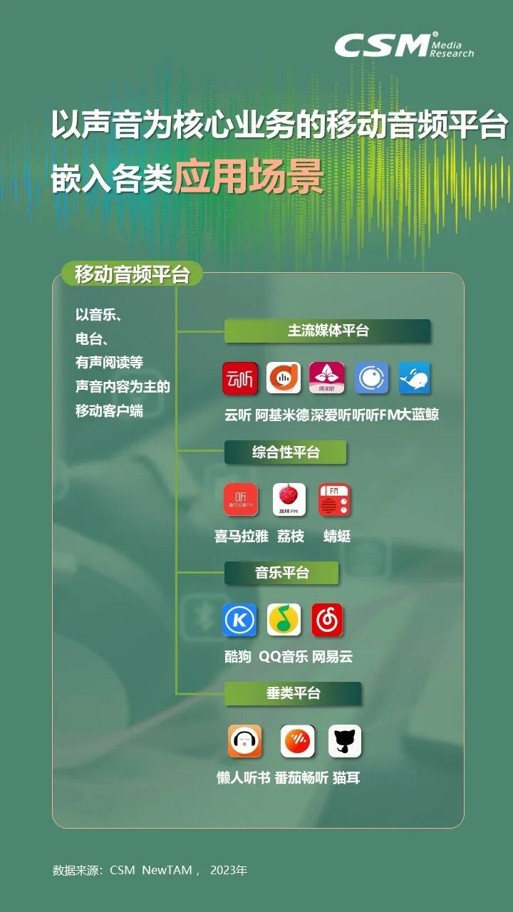 尽管传统广播端收听总量多年来呈现缓慢缩水的态势,但是车载端收听则呈现出稳定上涨的局面,23年全面超越居家收听。同时,随着音频APP的广泛渗透和台网共生传播模式的加持,广播/音频每日人均收听时长已经达到了126分钟,收听总量实现了9.9%的同比增长。这充分表明,广播/音频消费已经成为现代人日常生活中不可或缺的一部分,随着车联网和AI智能网联时代的贴近,广播/音频市场正迎来前所未有的发展机遇。