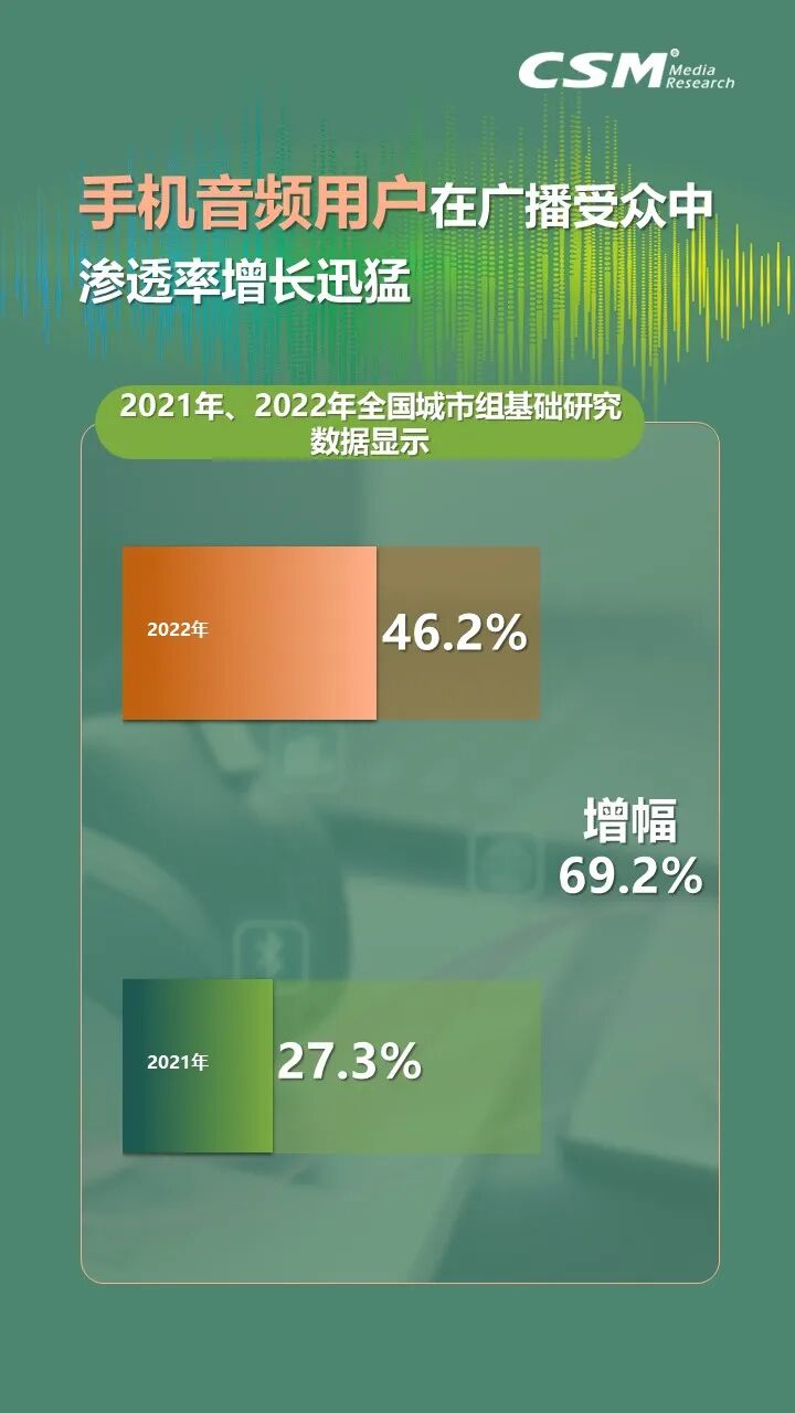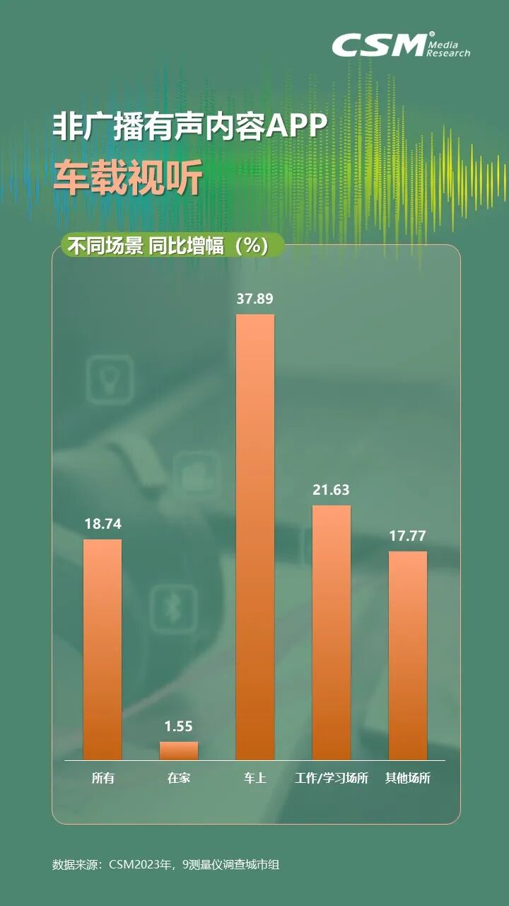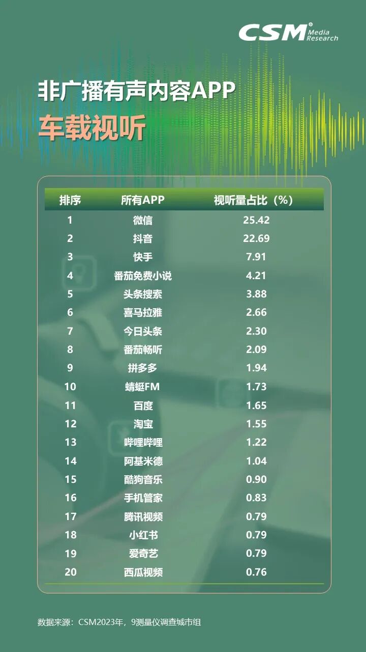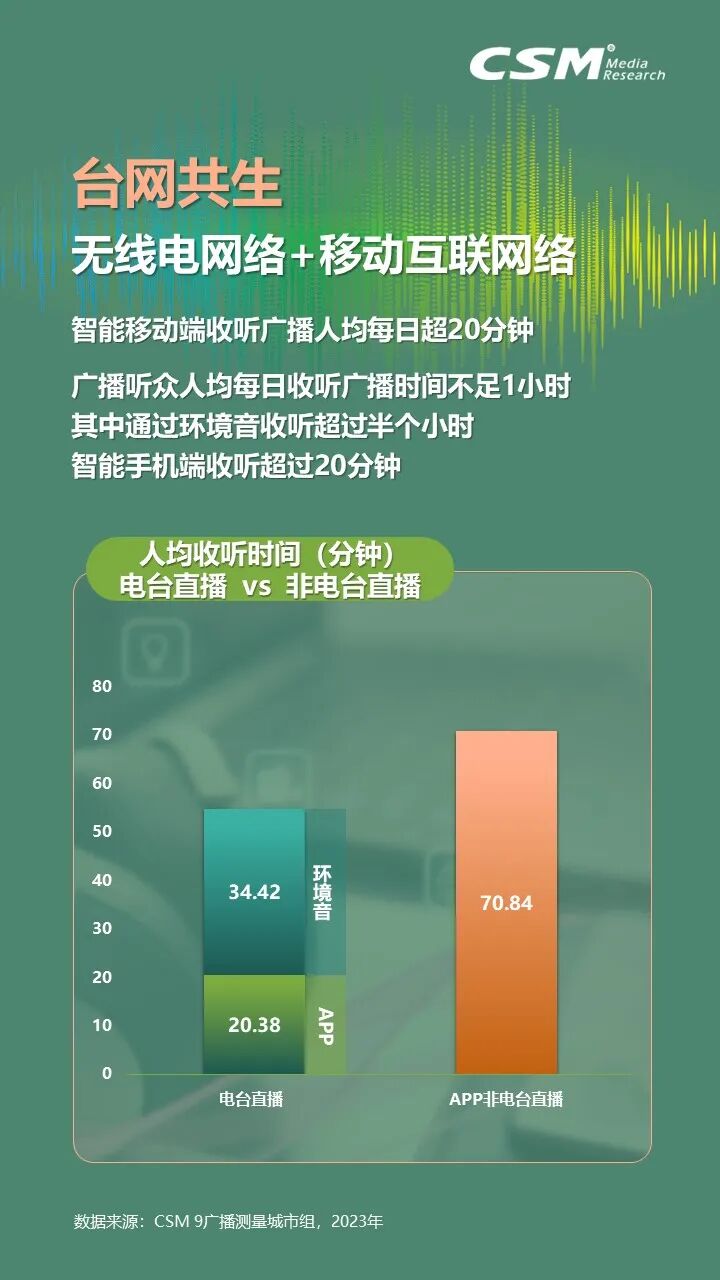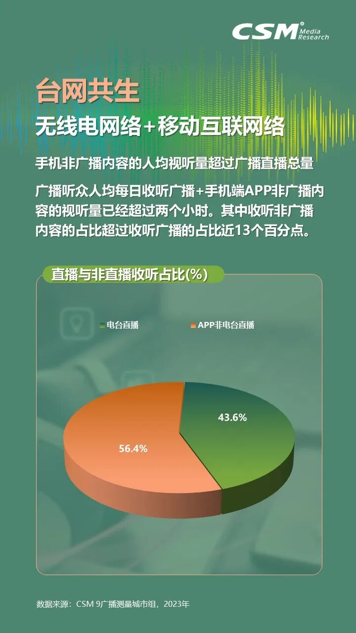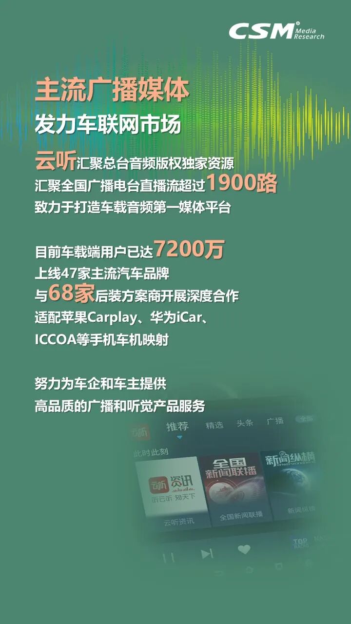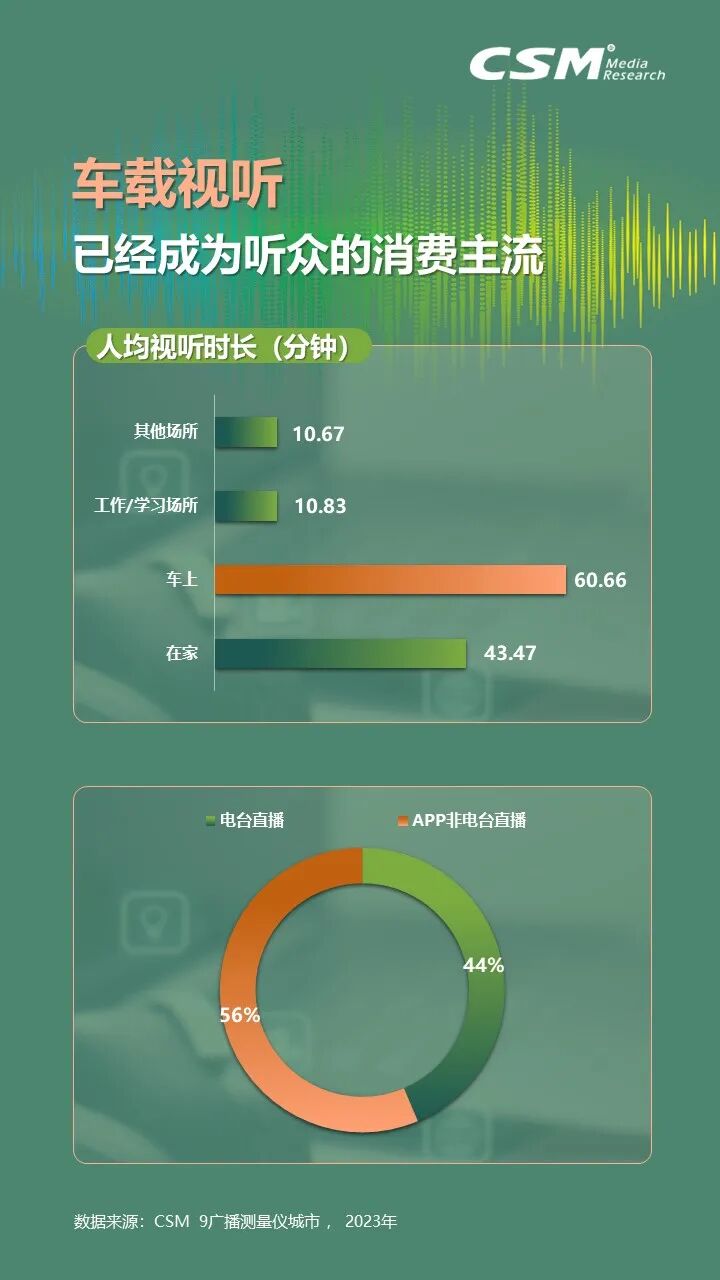 尽管传统广播端收听总量多年来呈现缓慢缩水的态势,但是车载端收听则呈现出稳定上涨的局面,23年全面超越居家收听。同时,随着音频APP的广泛渗透和台网共生传播模式的加持,广播/音频每日人均收听时长已经达到了126分钟,收听总量实现了9.9%的同比增长。这充分表明,广播/音频消费已经成为现代人日常生活中不可或缺的一部分,随着车联网和AI智能网联时代的贴近,广播/音频市场正迎来前所未有的发展机遇。