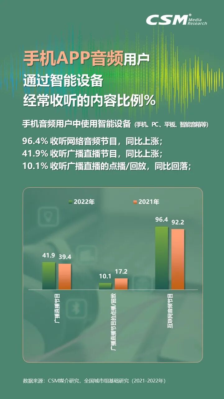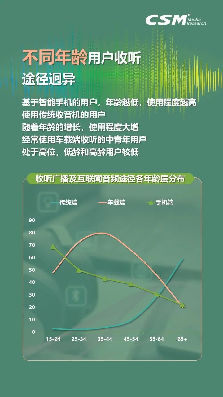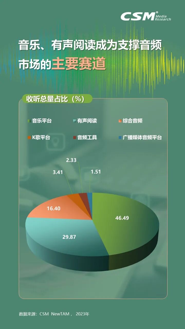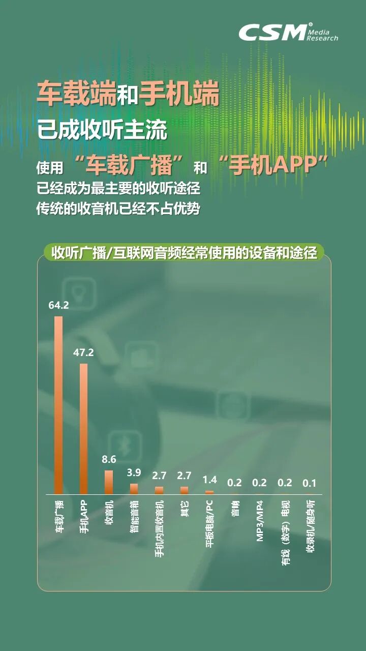 2023年,广播/音频市场再度翻开了新篇章。在这充满变化的一年中,由广播和音频共同构筑的以“听”为主的新生态渐变演化,通过以声音为核心内容建设的多类型的移动音频平台,深度融入生活的方方面面。通过车载端和手机端收听已成为主流收听方式,引领着广播/音频消费的潮流。在移动端的音频消费中,音乐、有声阅读等内容已成为市场主流,占据了超过七成的收听总量。