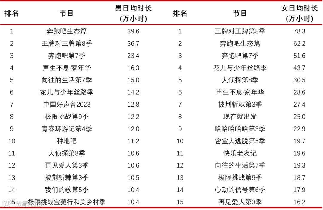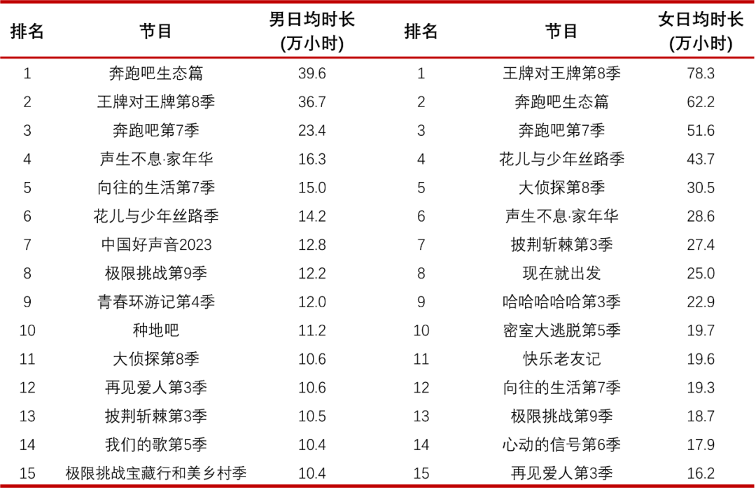 2023年移动端 分性别日均视听时长TOP15季播综艺