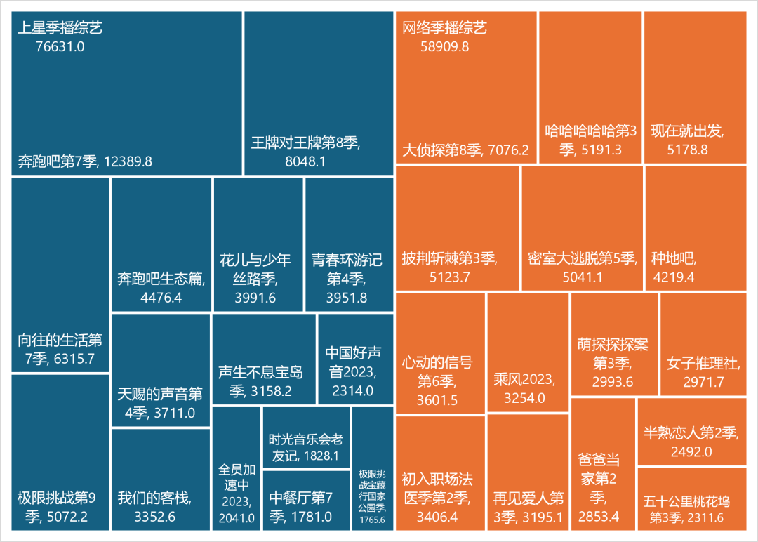2023年,移动端视听总时长排名前15的季播综艺中,有13档为综N代节目,另外2档为上新综艺。排名前3位分别是《奔跑吧第7季》(视听总时长12389.8万小时)、《王牌对王牌第8季》(视听总时长8048.1万小时)和《大侦探第8季》(视听总时长7076.2万小时)。