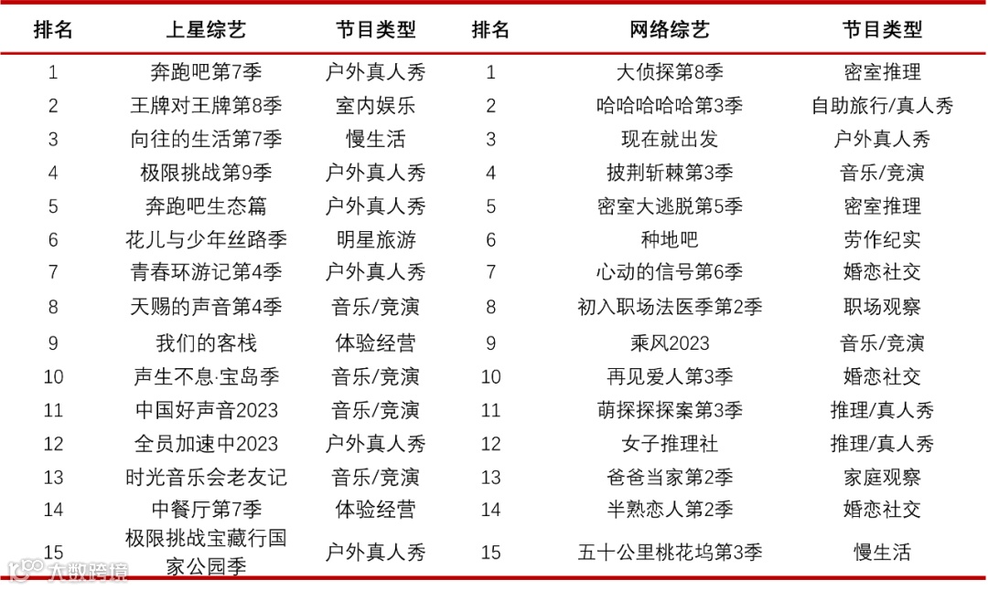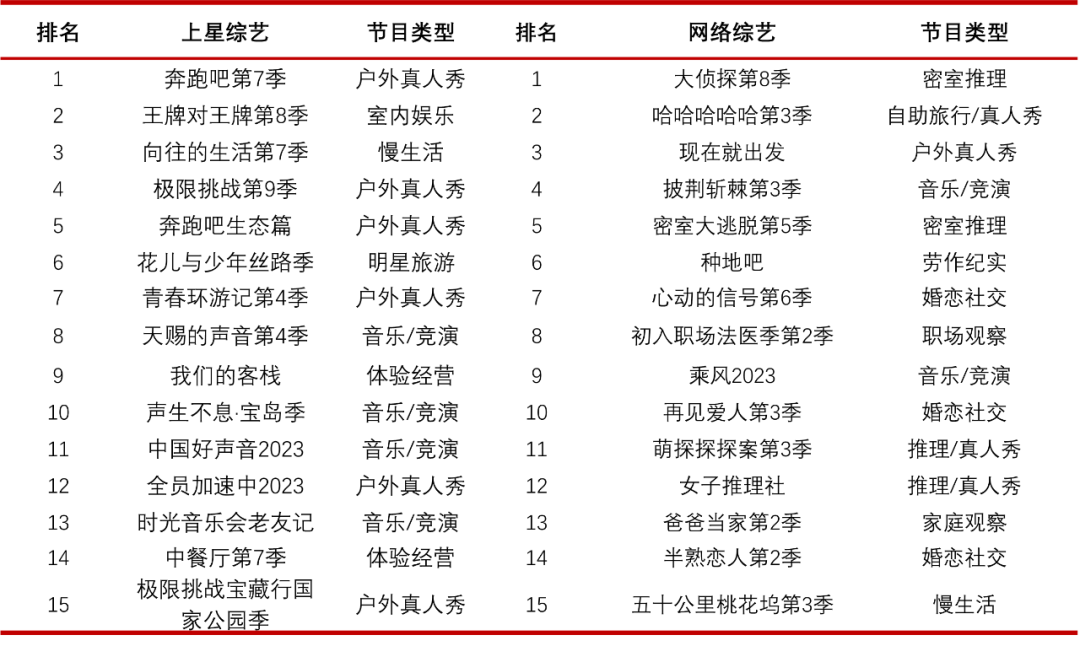 上星季播综艺视听总时长TOP15榜单中,上榜节目类型多以明星室内/户外真人秀、音乐竞演为主,上述三种类型占据11个席位,“明星+游戏”和“明星+音乐”的模式广泛受移动端用户喜爱,多数上榜季播综艺节目在电视端同样表现亮眼。而从网络季播综艺视听总时长TOP15榜单来看,上榜节目类型丰富多样,不仅有与上星季播综艺相同类型的节目,还涉及到密室推理、自助旅行、婚恋社交、职场观察、劳作纪实、家庭观察等。密室推理类节目上榜四档,《大侦探第8季》《密室大逃脱第5季》进入榜单前五,该类型节目通过新颖的主题、完整的剧情、紧张的氛围,展现了节目的观赏性和娱乐性,从而吸引用户;婚恋社交类节目上榜三档,恋爱与婚姻关系的探讨,持续为“她综艺”赋能。网络综艺中丰富的垂类节目,满足了用户更多元化的观看需求,从而提升了网络季播综艺在移动端的总体视听竞争力。
