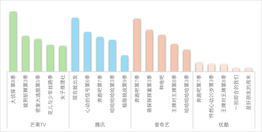 《奔跑吧》《王牌对王牌》《大侦探》《向往的生活》播出均超过7季,节目的视听总时长仍然位居榜单前五;《奔跑吧》系列正片《奔跑吧第7季》视听总时长断层领先。《奔跑吧生态篇》作为《奔跑吧》IP的衍生系列,虽仅播出7期,也有不俗的视听表现。