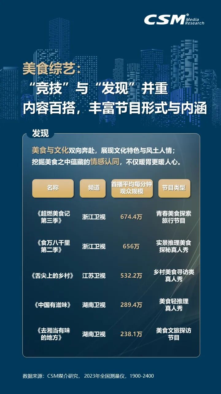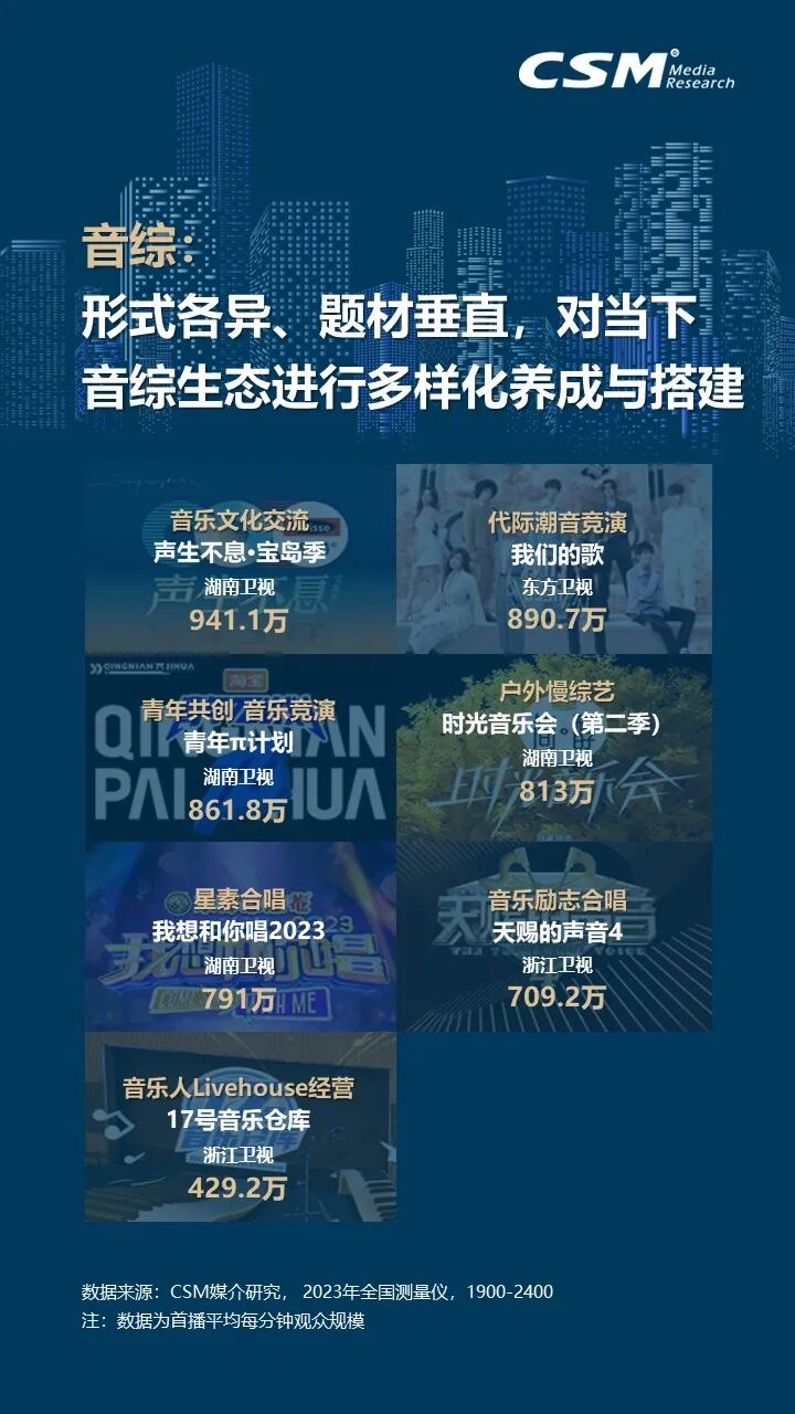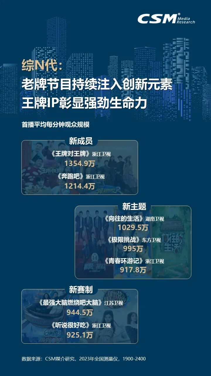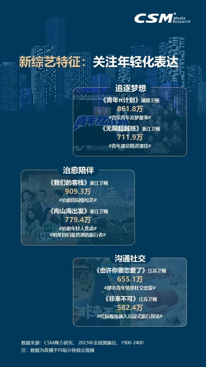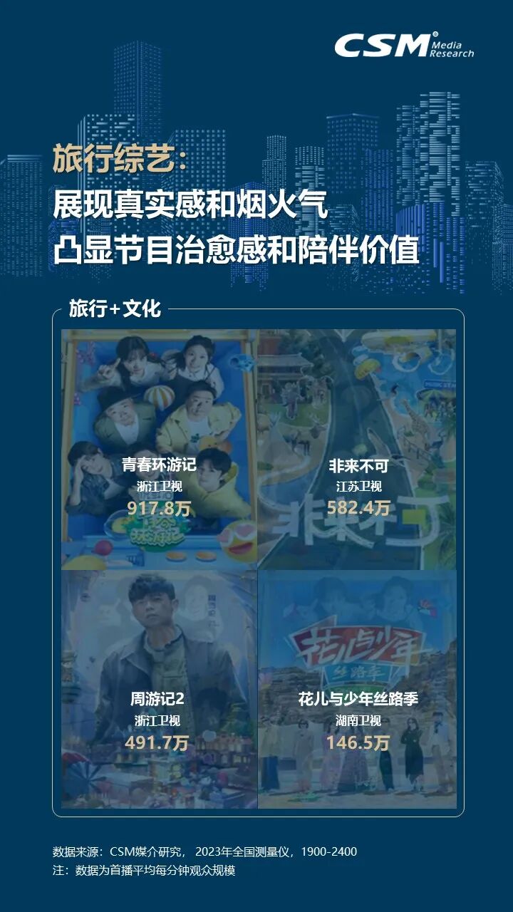 2023年,文娱市场强势反弹,综艺节目百花齐放,综N代节目持续焕发新活力,通过引入新成员、探索新主题和采用新赛制,不断满足观众的需求。在多元化综艺市场中,“文化+”类综艺成为新亮点,总台节目聚焦宏大主题,注重戏剧化和影视化表达,而省级卫视则更偏向垂直微观主题。音乐、美食和旅行类综艺也各具特色,共同展现了综艺节目的多样性和创新性。