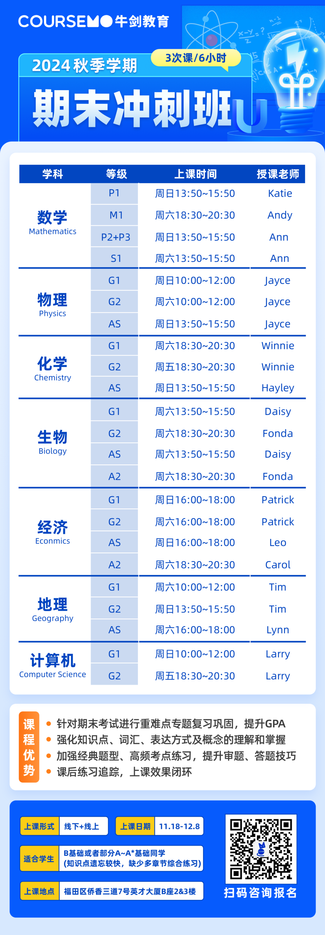 名校申请离不开好的GPA,期末考试在即,期望在短期内提升自己成绩等级的同学,欢迎加入我们的期末冲刺班!