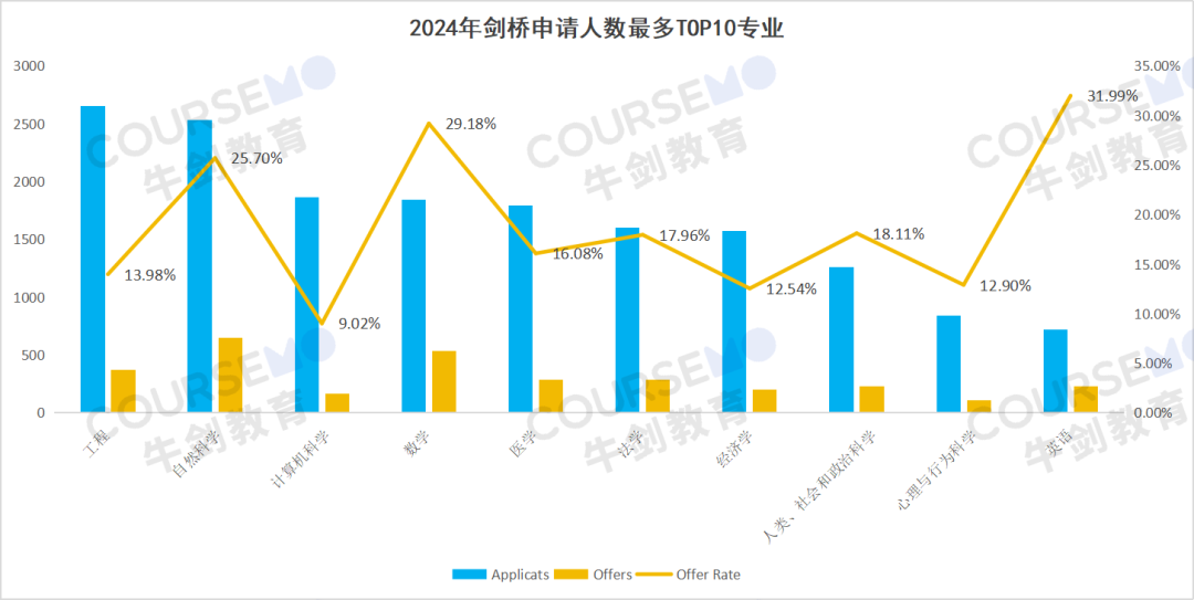 从2024年申请人数来看,剑桥的工程专业居榜首,有2654人申请,自然科学与计算机科学居第2、第3。其次是数学、医学、法学、经济学、HSPS(人类、社会和政治科学)、心理与行为科学、英语。