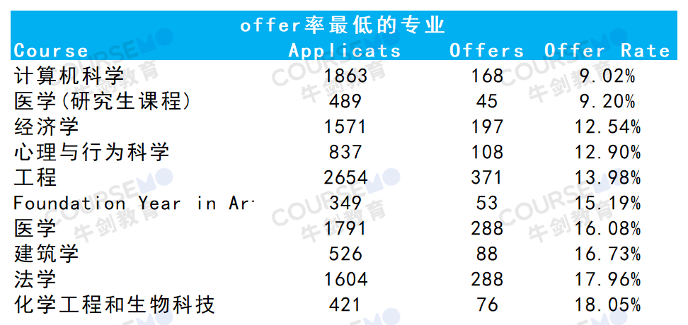如数据所示,计算机科学专业不仅是十大受欢迎专业中录取率最低的专业,也是剑桥所有专业中录取率的倒数第1。