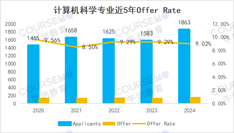 计算机专业,我们前面提到过,是剑桥offer率最低的专业,从近5年的offer率来看,趋势较为稳定,不过2024年9.02%的offer率低于前两年,申请人数达到近5年最多,比2023年多将近300人。