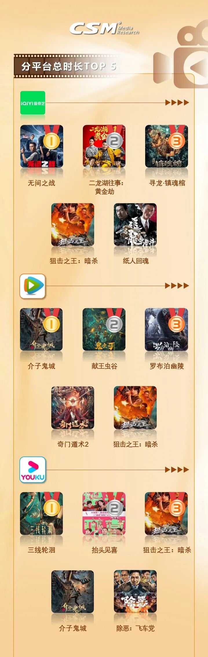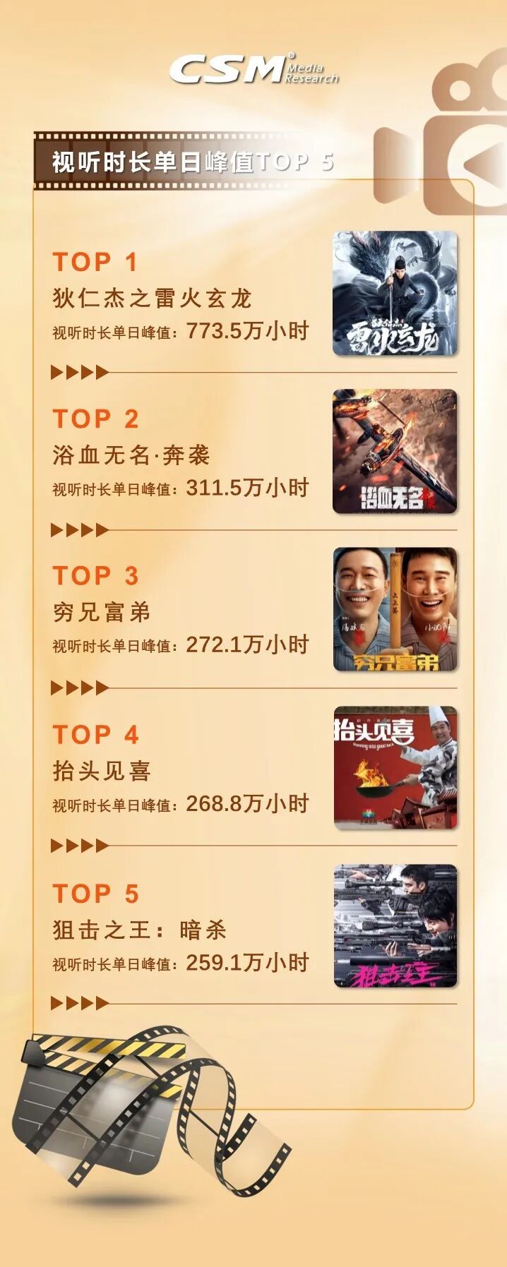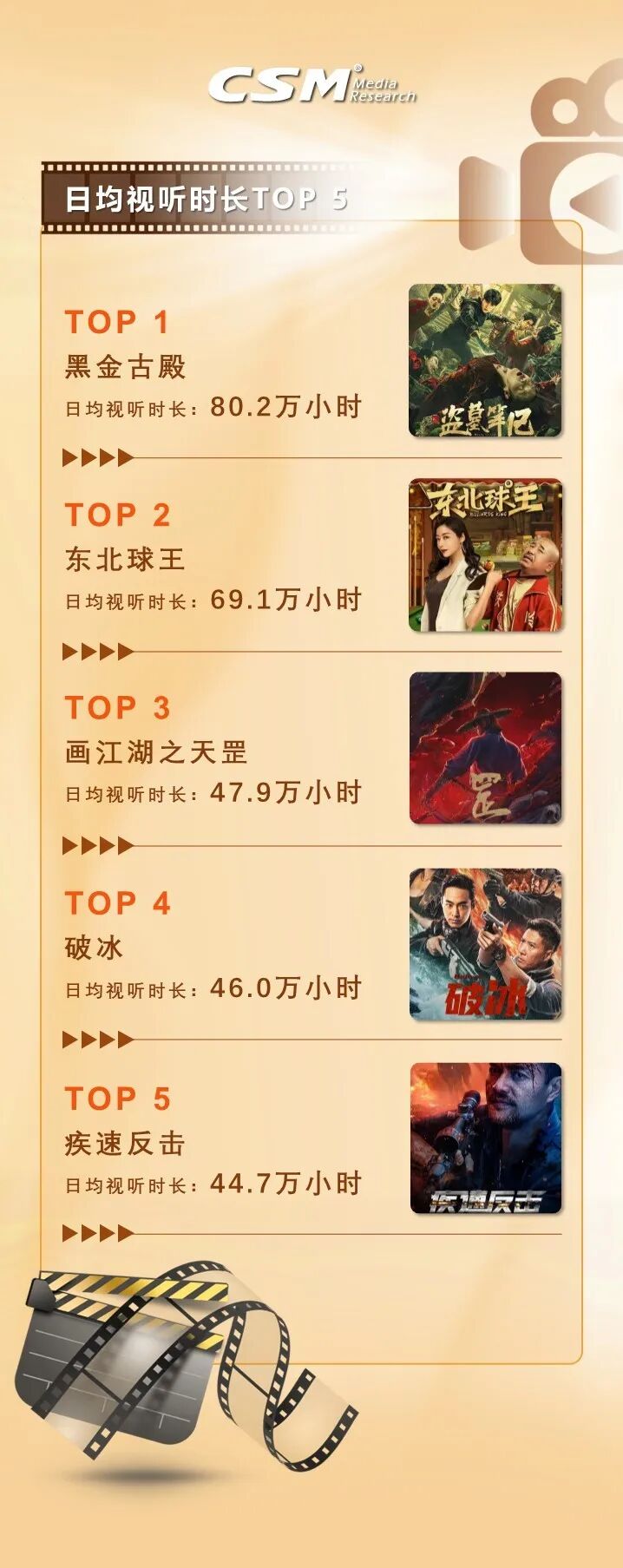 被纳入统计结果的共有5部电影,在上线后90天内,这5部电影共获得了1.6亿小时的视听总时长。