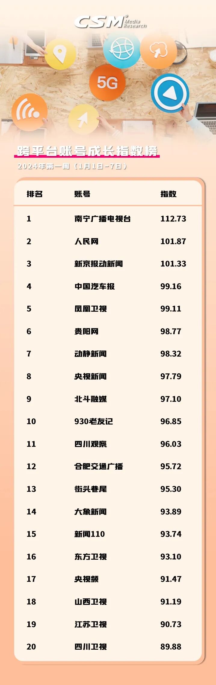 侧重账号自身成长的量化变化,指数计算侧重于账号传播数据随时间的改变,体现为账号相对自身的成长,可以实现账号自身的纵向 (时间方向)对比。平台包括抖音、快手、微博、微信视频号、今日头条、腾讯新闻、央视频等,计算指标包括粉丝量环比,播放量环比,点赞量环比,评论+转发环比等。指数动态更新,平台和指标会随融合传播发展状况适时调整。