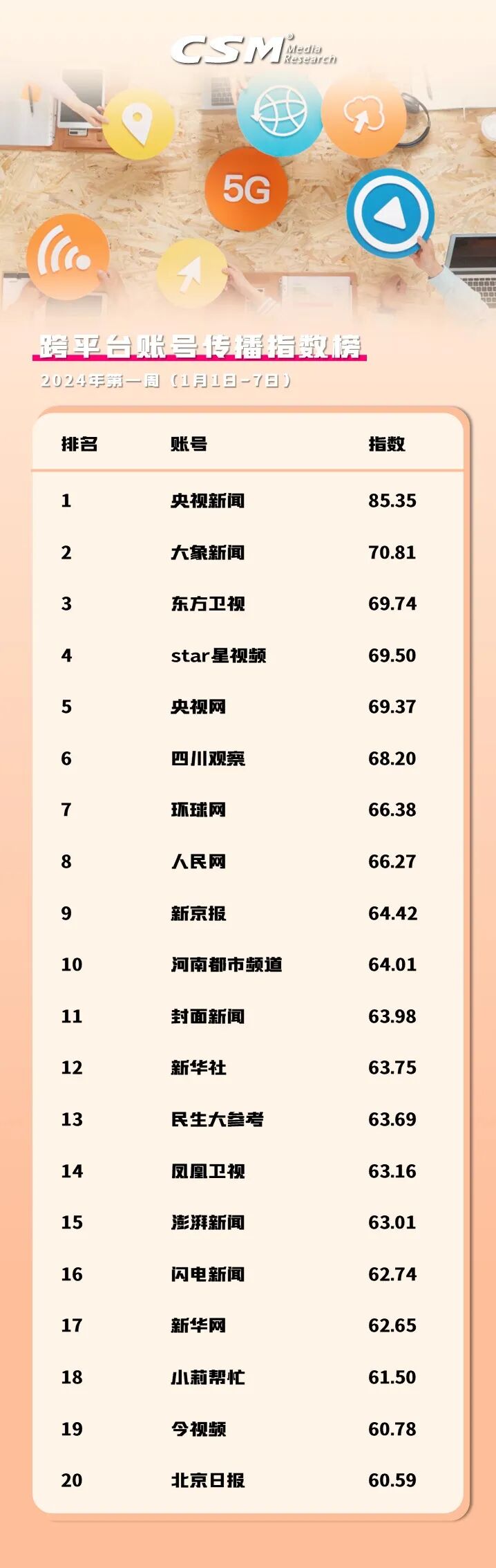 呈现账号实体在全网多个平台上的综合传播表现,侧重于跨平台、量化的传播数据,底层原理与新闻融合指数类似,可以实现账号之间的横向对比。平台包括抖音、快手、微博、微信公众号、微信视频号、今日头条、好看视频、腾讯新闻、腾讯视频、网易新闻、土豆视频等11个平台,计算指标包括发布量、播放量、评论量、点赞量、转发量、粉丝量和引领力等指标。指数动态更新,平台和指标会随融合传播发展状况适时调整。