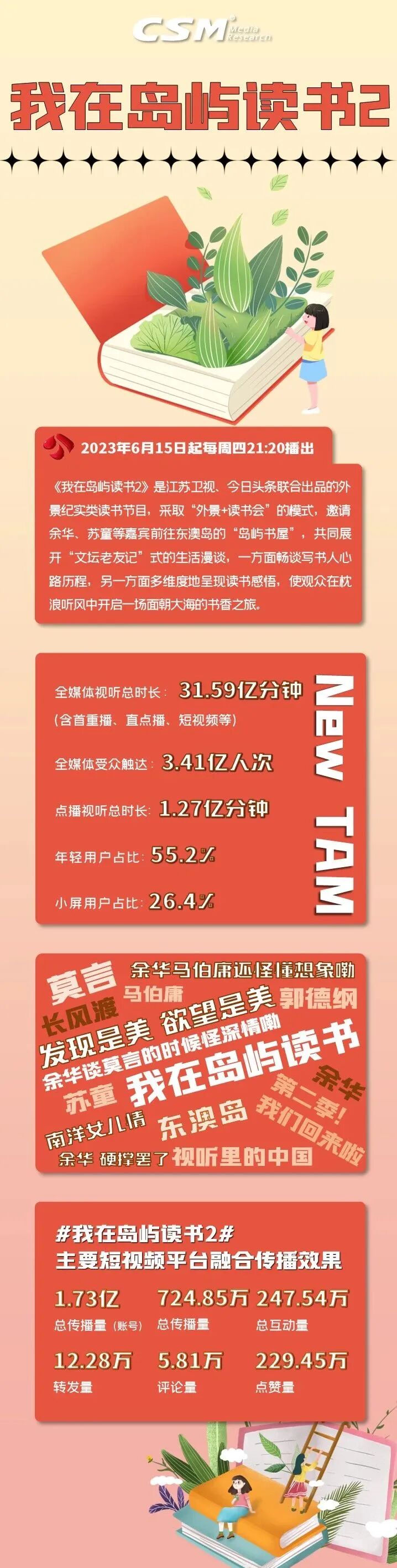 高品质文化人文类节目同样也是节目创新矩阵中的排头兵,从承载着善意与美好的《子夜外卖》,到引领阅读浪潮的《我在岛屿读书2》、共创潮流地标的《野挺有趣》,再到领略国风生活的《万卷风雅集》,纷纷驻足传统文化,以全新视角展现了“人文+”的魅力。本期,为您带来由江苏卫视播出的多档文化类节目的全媒体视听表现。