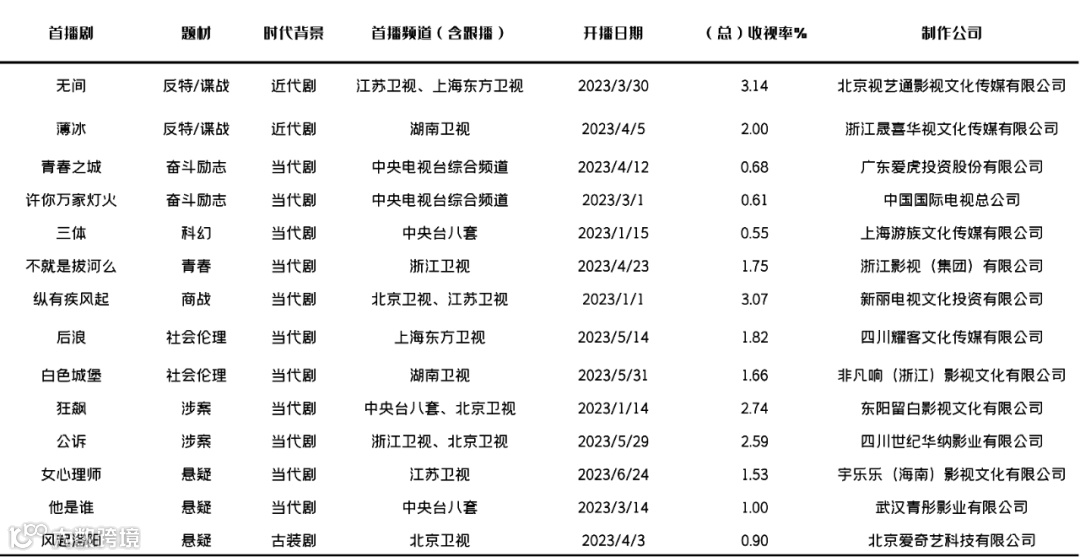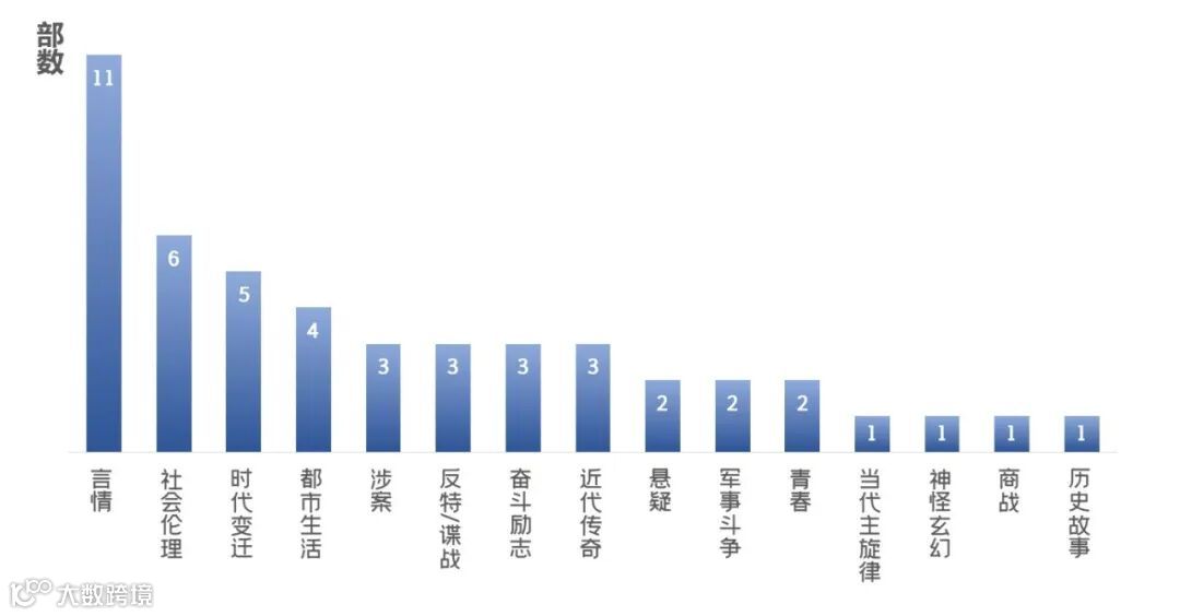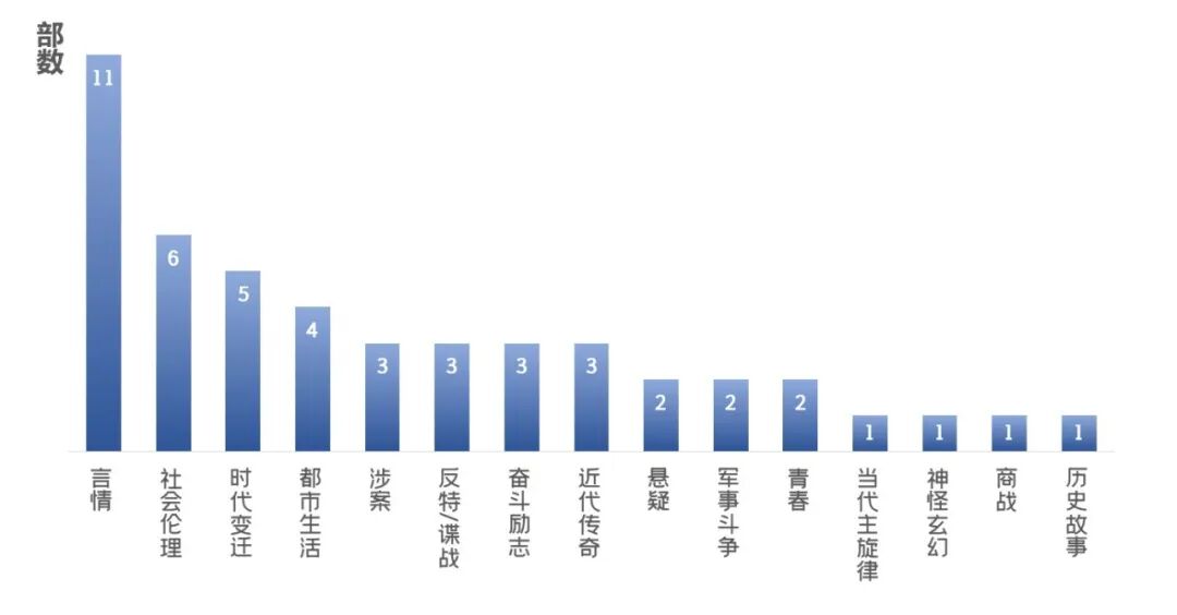 此外,涉案、反特/谍战、奋斗励志、近代传奇这几类题材各占3部,悬疑、军事斗争、青春类题材各占2部,当代主旋律、神怪玄幻、商战、历史故事等题材各有1部。