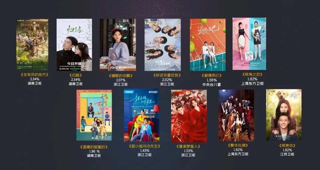 言情剧大放光彩,不仅数量上碾压其他题材,而且展现出强悍的收视竞争力,11部首轮剧在卫视黄金档均采取了独播模式,收视率均破1%;《去有风的地方》《归路》《耀眼的你啊》《听说你喜欢我》收视率均破2%。