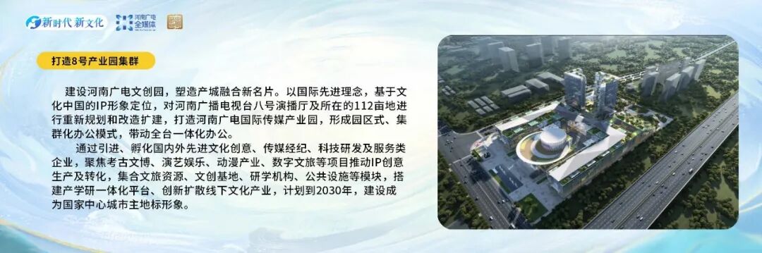 探索和强化“文化+创新产业”、“文化+融媒体”的发展之路,打造更多原创文综项目集群,打造河南广电文创IP心智群体,打造8号产业园集群,用文化赋能产业,将文化艺术融入生活,与世界共享生活美学。