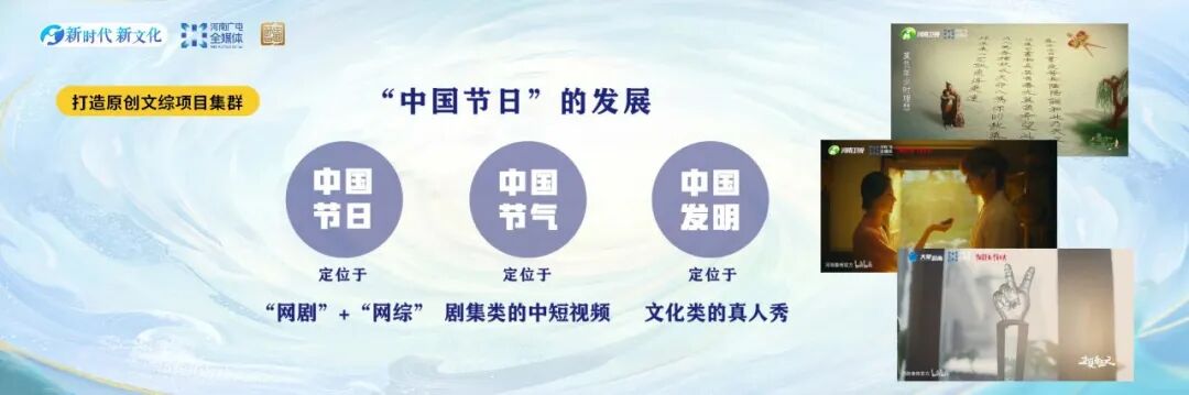 利用科技赋能文化通过创意加持文化,助力河南文旅产业融合。在中国节日系列节目创作中,将文创项目深入融合结合自身的优势,挖掘传统模式的新业态。从2021年开始,河南卫视中国节日系列红遍大江南北,截止目前已经走过河南、云南、浙江、云南、山西、广东等19个省份,河南11个地市,节目取景地从洛阳、婺源、赵县到新疆等地。
