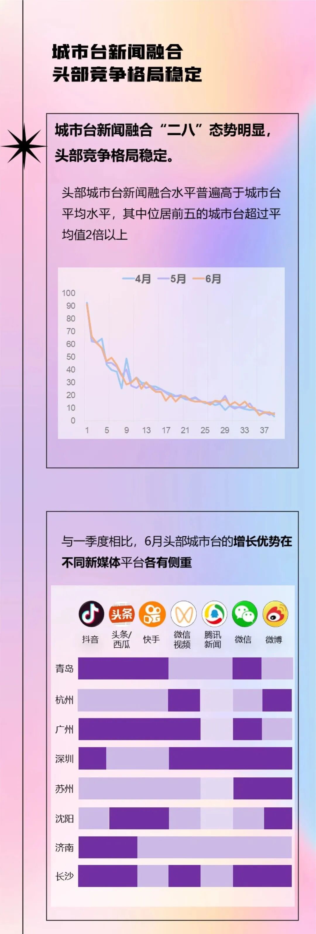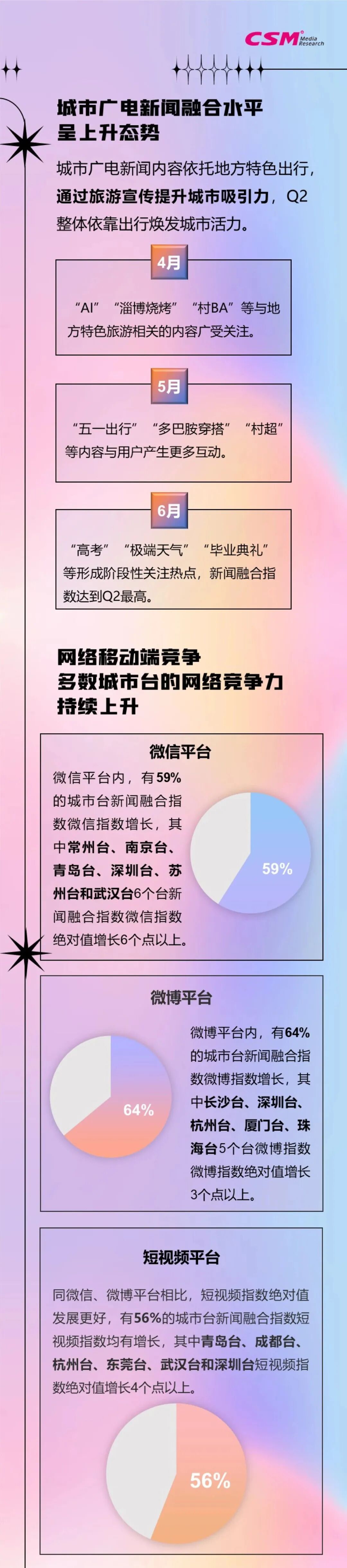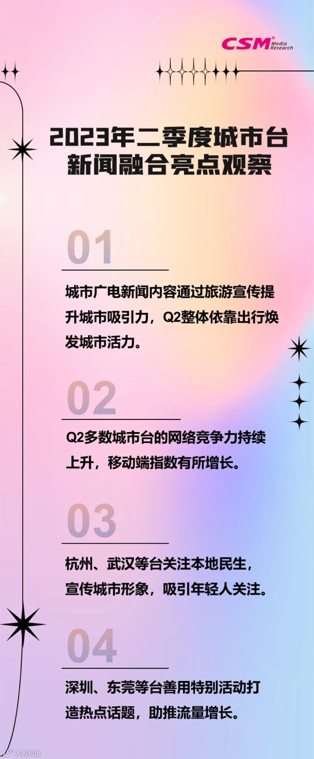 2023年第二季度,城市台在移动端的新闻内容持续发展,超过一半的城市台在微信、微博和短视频平台上的网络竞争力持续提升。通过旅游宣传,Q2城市广电新闻内容提升了城市的吸引力,整体依靠出行焕发城市活力,竞争格局保持稳定。