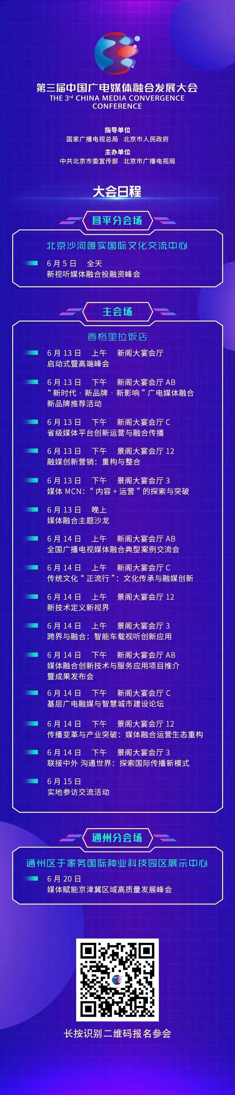 由国家广播电视总局、北京市人民政府指导,中共北京市委宣传部、北京市广播电视局主办的第三届中国广电媒体融合发展大会将于 6月13日至15日在京举办。本届大会除在北京设置主会场举办大会主体活动以外,还在昌平、通州设置分会场,举办相关专题活动。