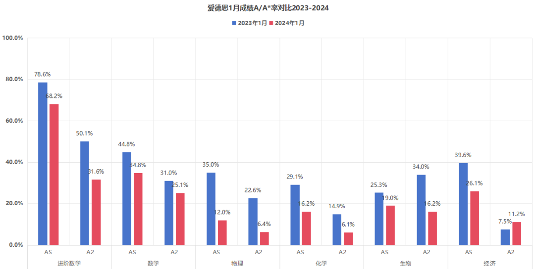 小Mo整理了今年爱德思A/A*率与去年1月及6月的对比,如下。完整版爱德思2024年1月大考成绩报告请戳小助手领取哦~