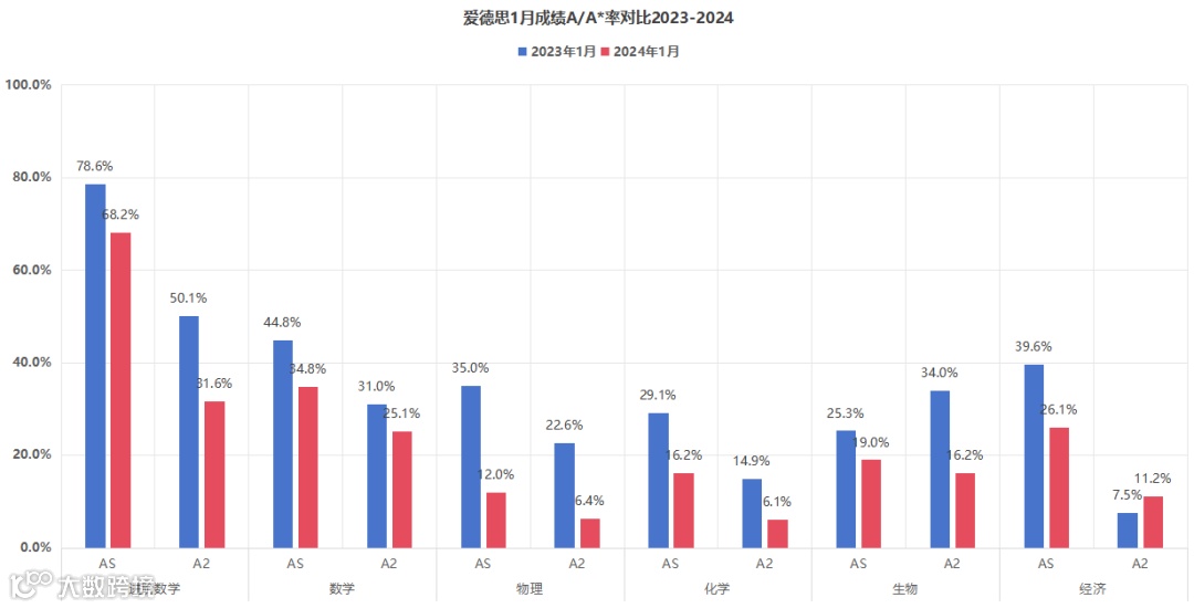 可以看出,相对2023年1月的成绩,不论是AS的A率还是A2的A*率在2024年1月都出现了一定程度上的下降,只不过物理学科相对下降幅度更大。