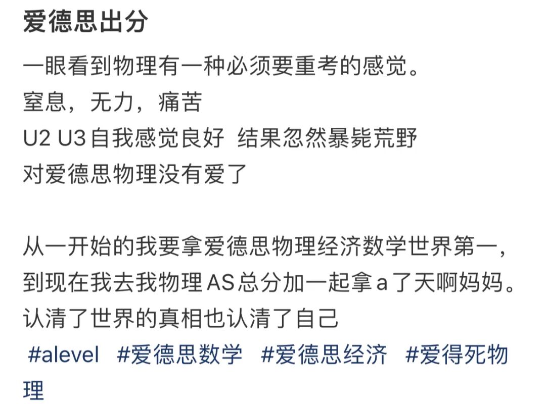 1月份爱德思考完后在某书上就有同学开始讨论物理太难,但也有同学表示以为自己考得不错结果成绩出来一个b……