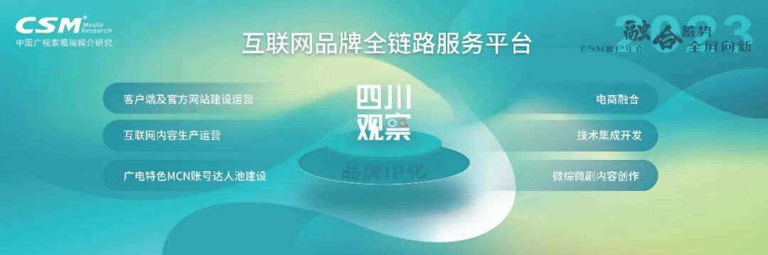 2023年6月20日-21日,由中国广视索福瑞媒介研究有限责任公司(以下简称CSM)主办的「融合蓄势 · 全屏向新」2023CSM客户年会在青海西宁成功举办。四川广播电视台编委、《四川观察》总经理岳学渊分享了《四川观察》构建了商务、平台、技术“三大中心”为主的支撑架构,不仅提高了公司的运营效率,还为公司在媒体融合转型之路上的发展奠定了坚实的基础。