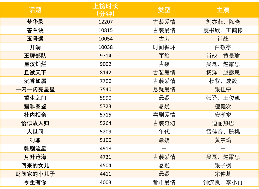 2022年微博热搜话题榜中,电视剧类型占比达到了9.99%,仅次于社会类,优质电视剧当中蕴藏了对生活、历史、文化和人性的种种语言和思索,同时也是大众精神娱乐消费的重要内容形态之一。从2022年电视剧热搜话题在榜时长TOP20可以发现,古装爱情和悬疑两类电视剧受用户的关注度较高,分别有8部和5部进入电视剧热搜话题榜TOP20中。其中,古装爱情剧目依靠流量艺人演绎的爱情故事吸引大批女性观众,如刘亦菲主演的《梦华录》以12207分钟在榜时长位居第一。新形态的悬疑剧近些年层出不穷,且对观众的吸引力不断增强,如2022年的《开端》《猎罪图鉴》《重生之门》等一批出色的悬疑剧持续登上微博热搜榜(表1)。要说2022年最火的电视剧是哪一部,总台开年大剧《人世间》是很多人心中的答案,电视剧聚焦中国社会50年变迁史,动情刻画中国人民坚忍拼搏、积极奋斗、永葆乐观的美好品质,一度形成了老中青同时追剧的盛况。