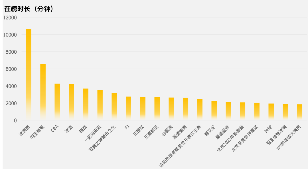 2022年体育类热搜话题TOP20中,北京冬奥会相关话题占据了13个,其中“冰墩墩”累计在榜时长达10642分钟,位居第一,“冰墩墩”作为北京冬奥会吉祥物,大众被其憨态可掬的造型吸引,北京冬奥会期间可谓“一墩难求”。除了北京冬奥会,CBA、WTT大满贯、F1、卡塔尔世界杯等也同样备受用户关注(图2);2022年是一个不折不扣的体育大年,还有很多体育赛事一度引爆社交网络,中国女足时隔16年重登亚洲之巅,中国女篮闯入世界杯决赛等重要时刻,带给我们惊喜与感动。