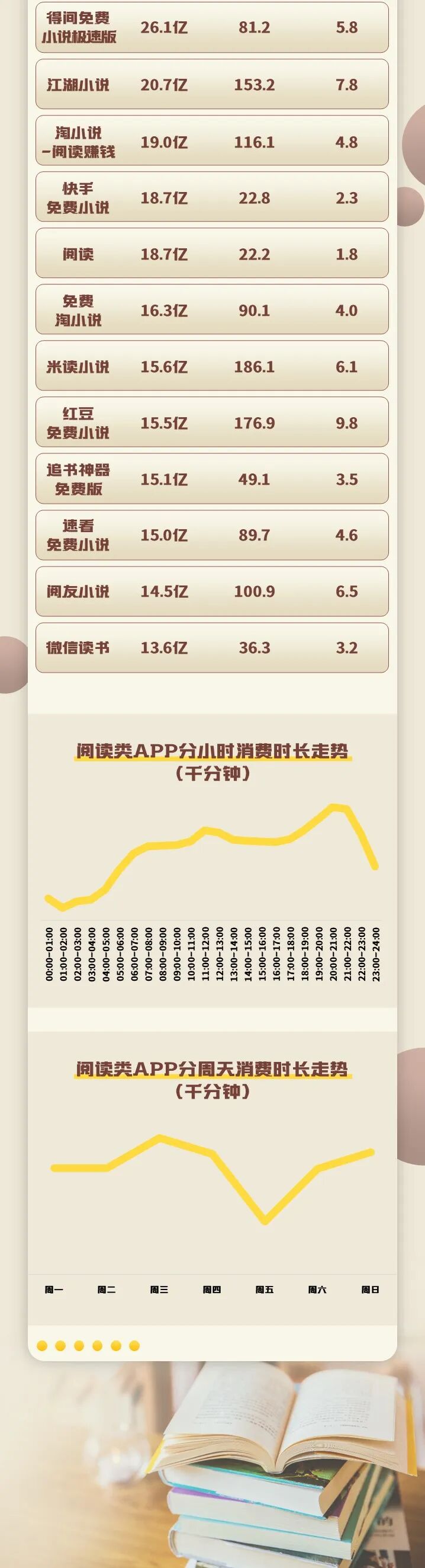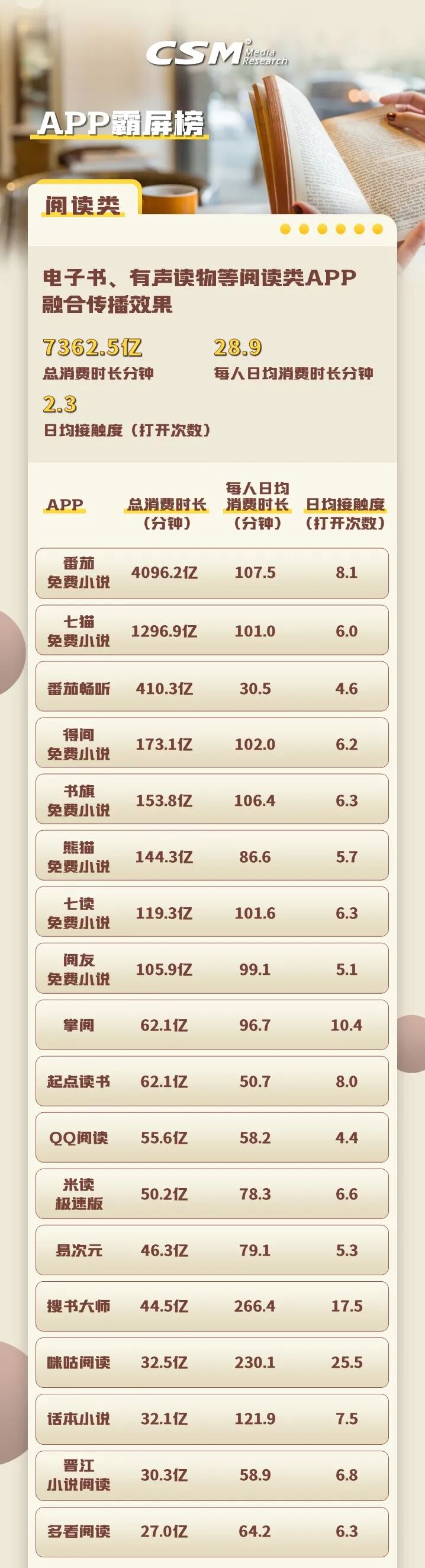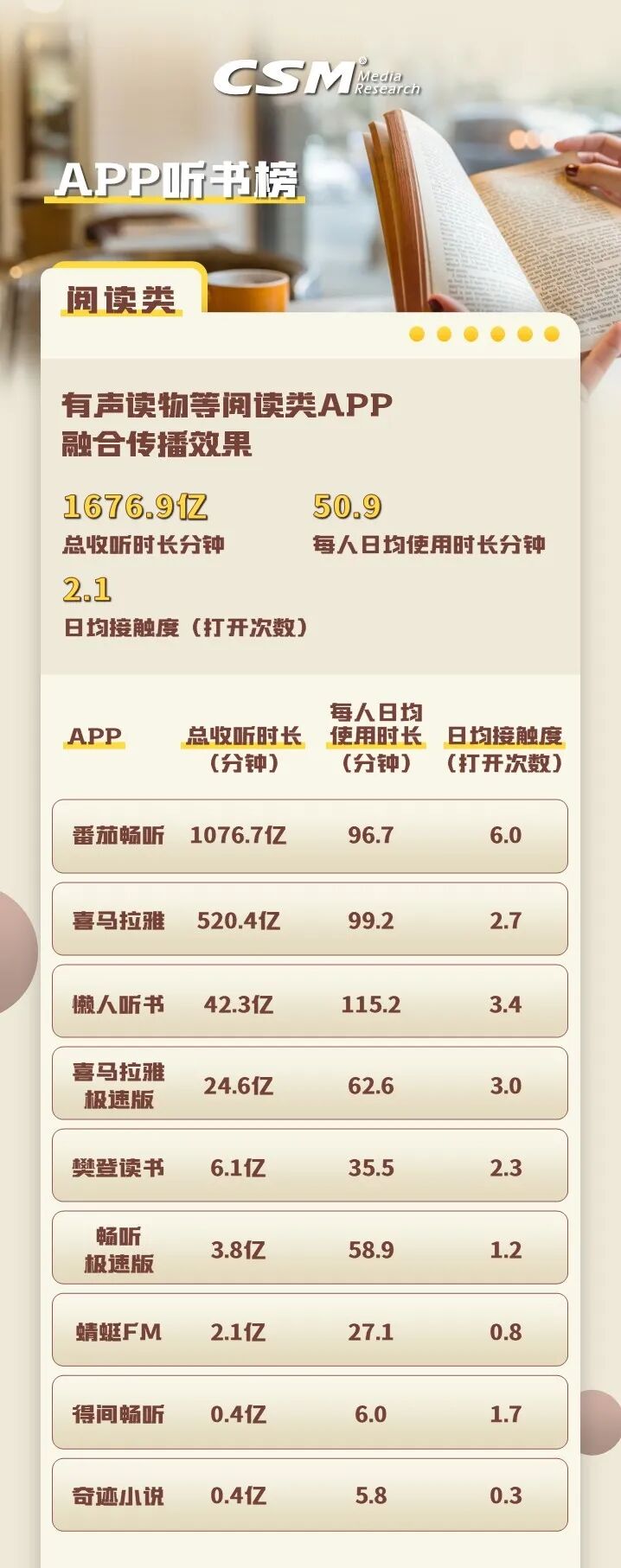 中国广视索福瑞媒介研究(简称 CSM)基于CSM全媒体视听同源数据(New TAM),对垂直APP细分研究。本期挑选【电子书】【有声读物】等阅读垂类,发布2023Q1阅读类APP影响力洞察,通过APP的分小时消费时长走势分析,看电子书的时段多集中在午间和晚间,而清晨则更集中于听书。“世界”这么大,我就想“读书”,日“日”有惊喜,年年不负卿。更多榜单信息如下,供业界参考。